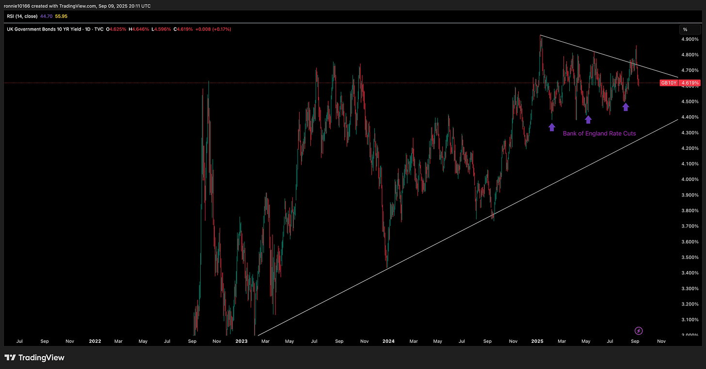 10 Year Gilts Update3 rate cuts keep yields higherIan ReynoldsSep 09, 2025SharePlenty of speculation around IMF bailouts, ministers resigning (2 did) and the general state of the UK economy. Actually, if the Bank of England hadn’t cut 3 times recently, yield might be a lot lower. PreviousNext