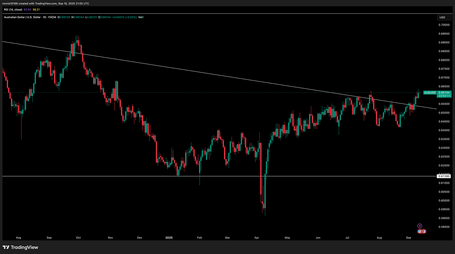 AUD/USD UpdateAussie breaks higherIan ReynoldsSep 10, 2025ShareAUD/USD the first beneficiary of USD bouncing along the bottom. EURO and GDP haven’t seen this strength of move yet. Does that make this a false flag? Needs a close and confirmation above 0.6625 to be sure.PreviousNext