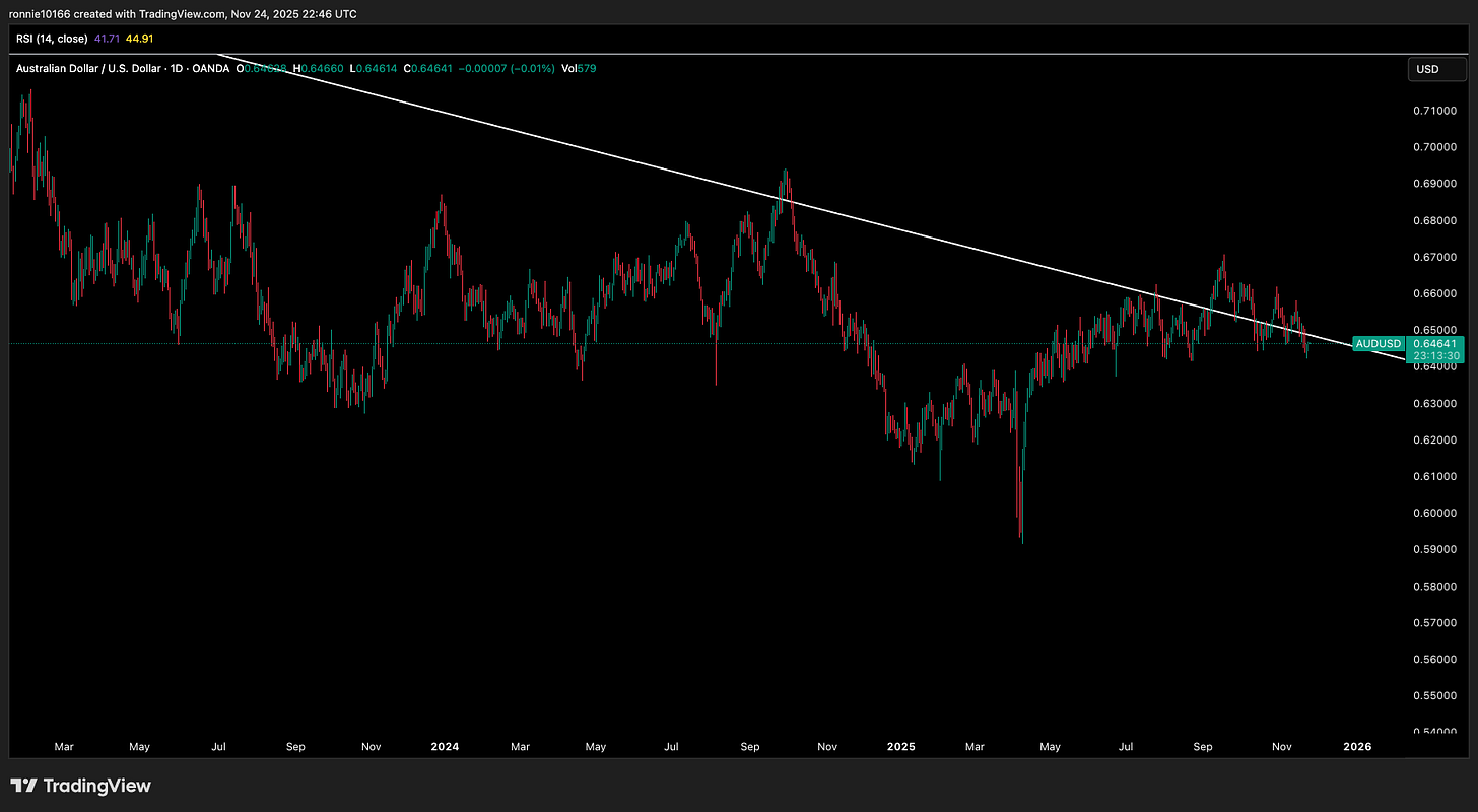 AUD/USD Update 25 November 2025Canary in the mineIan ReynoldsNov 24, 2025∙ PaidShareThat downtrend goes back to August 2011. Price now hugging it means we’re in for a definitive break. There are at least 5 failed breaks to the upside.This post is for paid subscribersSubscribeAlready a paid subscriber? Sign inPreviousNext