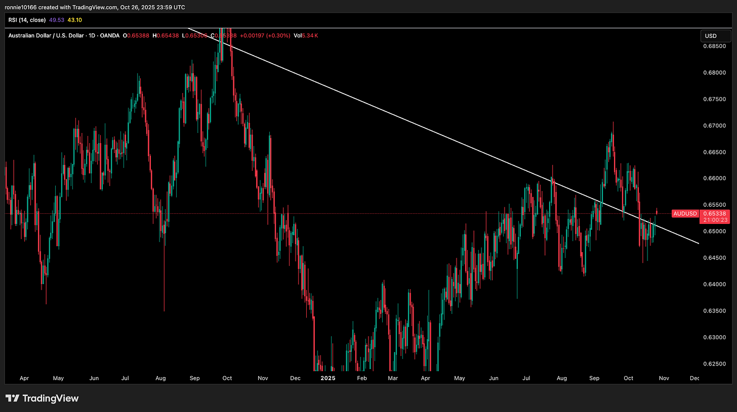 AUD/USD is absolutely glued to the 15 year trend line lower. If USD is bottoming as USD/YEN and USD/CAD now suggest, AUD/USD could return below the line and head towards 0.61 which price has visited a few times recently, but has not been below sustainably.