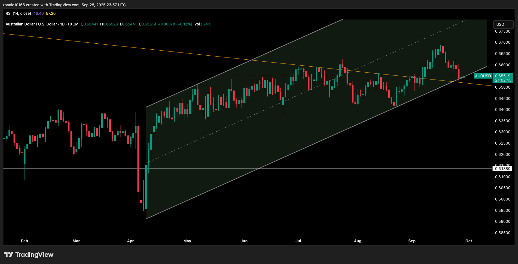 AUD/USD Update 29 September 2025Aussie back to supportIan ReynoldsSep 29, 2025∙ PaidShareAussie, unlike the Loonie, looking strong and back to the new trend support and the 15 year support.0.6710 is clearly the hurdle to get above, and below 0.6410 looks awful.So all eyes on the USD/DXY for direction.This post is for paid subscribersSubscribeAlready a paid subscriber? Sign inPreviousNext