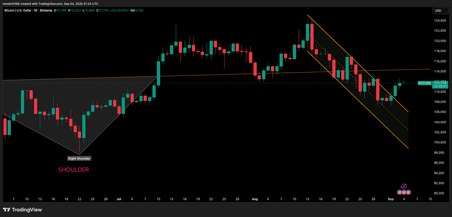Bitcoin Loses Downward MomentumIan ReynoldsSep 04, 2025ShareShort-term resistance broken but market structure still negative. 113.5k and 117.5k still upside targets while the double bottom at 107.3k provides support.PreviousNext
