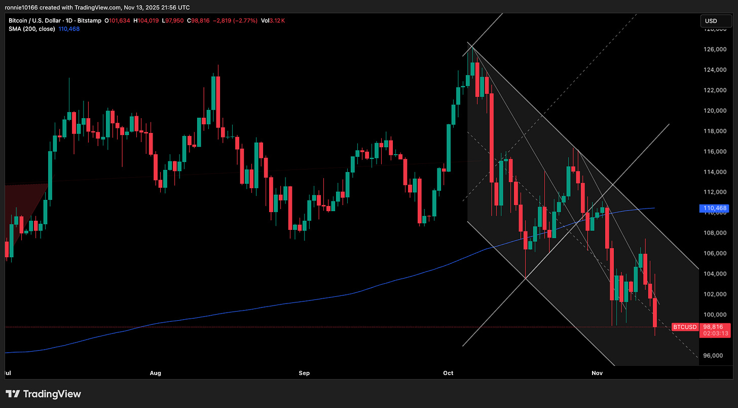 Price needs to regain the 200 day moving average at 100k really quickly to prevent a very quick trip to 75k or below.