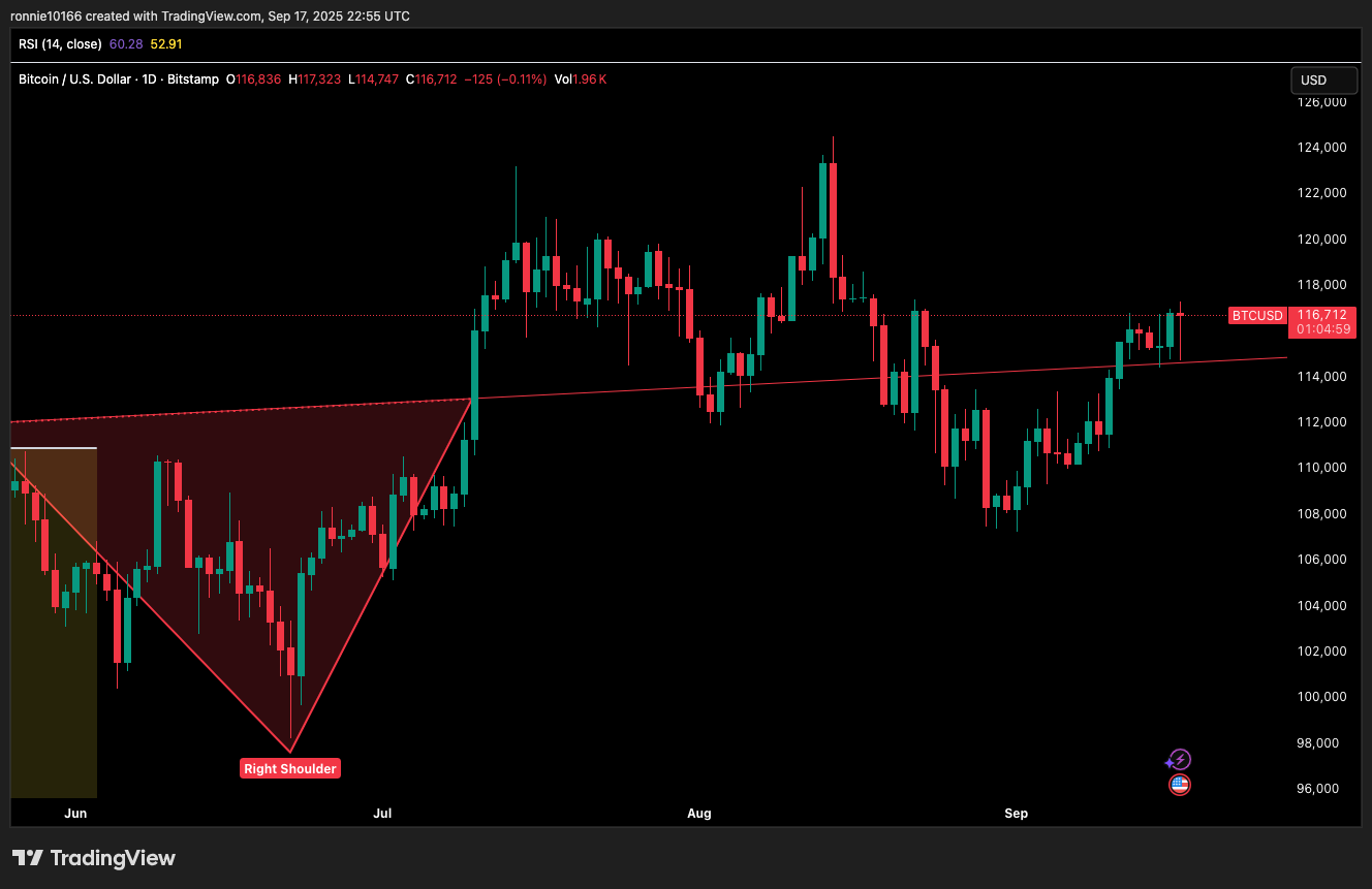 Despite only 25bps, sell-off was restricted to tagging the neckline again. We're looking at a bull flag now from the move up from 107.3k. Minor double top at 117.3 and breaking it would see price up to 123.3k. Any speculation of FED policy error i.e. cutting into inflation, will see price up to our target of 150k in the next 2 months.