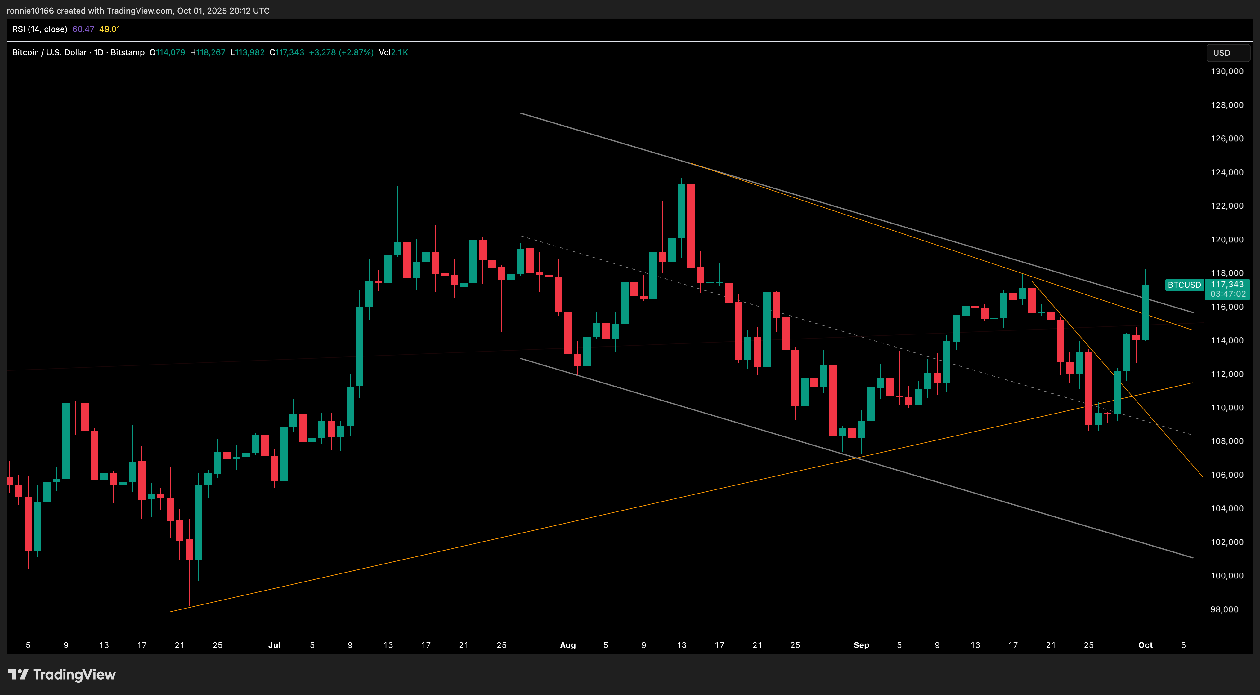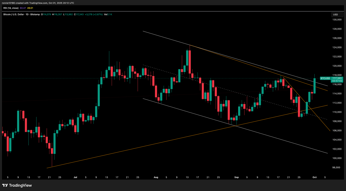 Closing above 116.5k is great but need price to move over 118k to create a higher high from the 18 September peak. Would suggest backtest to 115.4k is possible.
