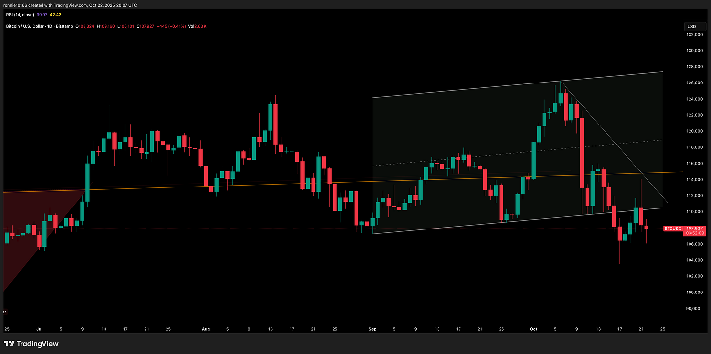 Bitcoin Update 23 October 2025Depressing reallyIan ReynoldsOct 22, 2025∙ PaidShareBitcoin continues to trade like a dog. All rallies are sold hard. Now approaching firmer support around 104k.This post is for paid subscribersSubscribeAlready a paid subscriber? Sign inPreviousNext