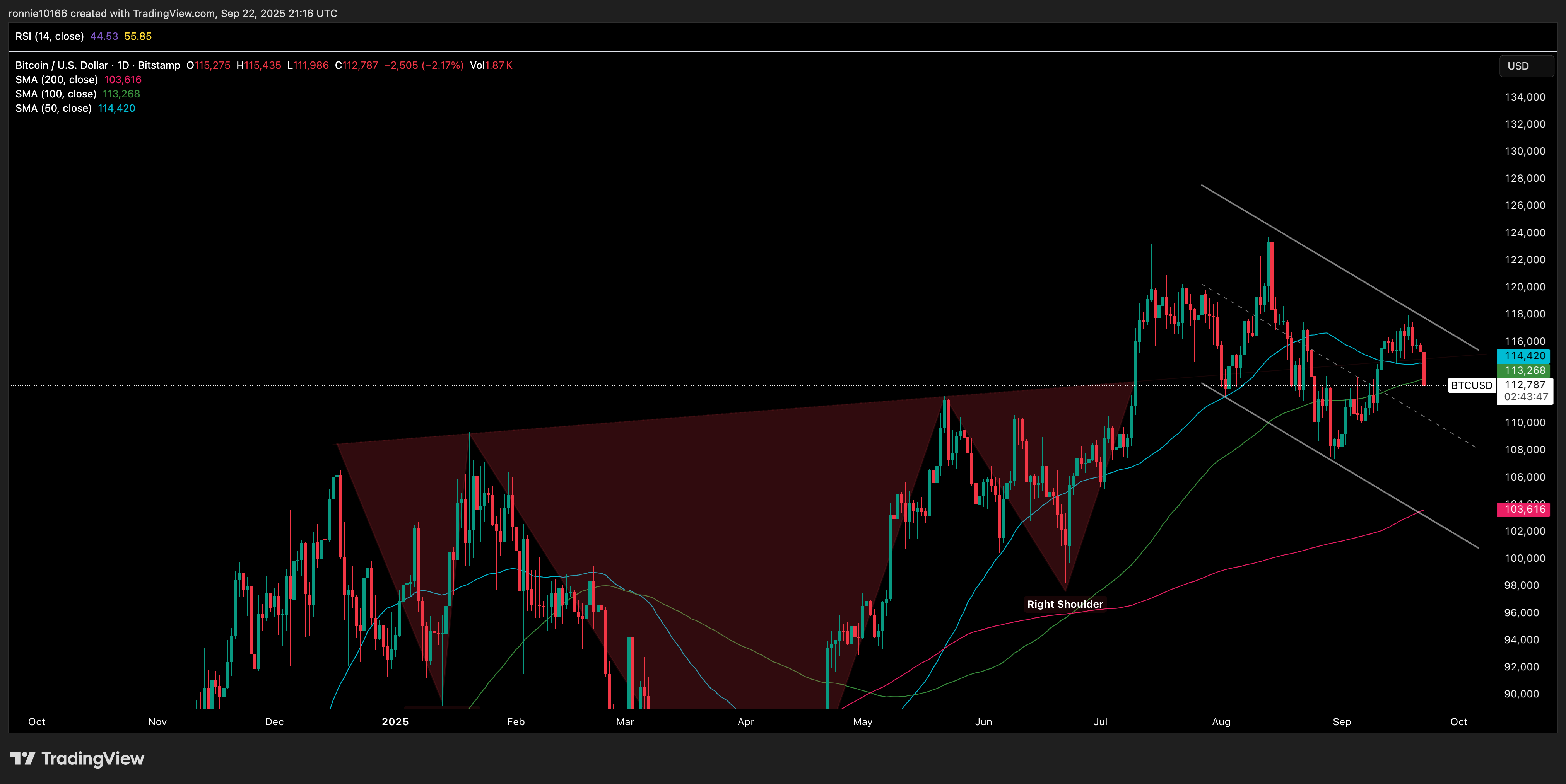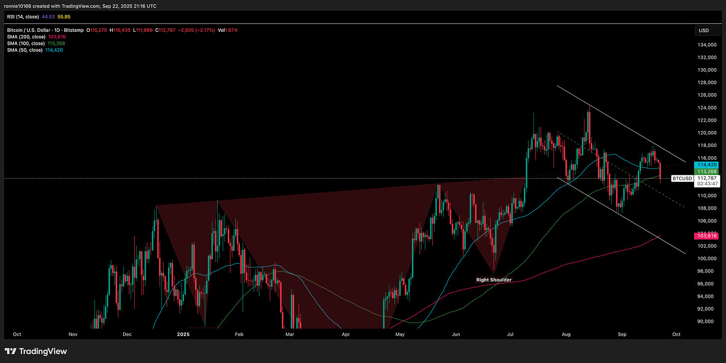 I have toned the inverse head and shoulders down for now. A great downside target would be 102k where trend support meets 200 day moving average. If you’re short now and can go long at 102k that would give you a nice buffer to sit back and wait for the cycle top.