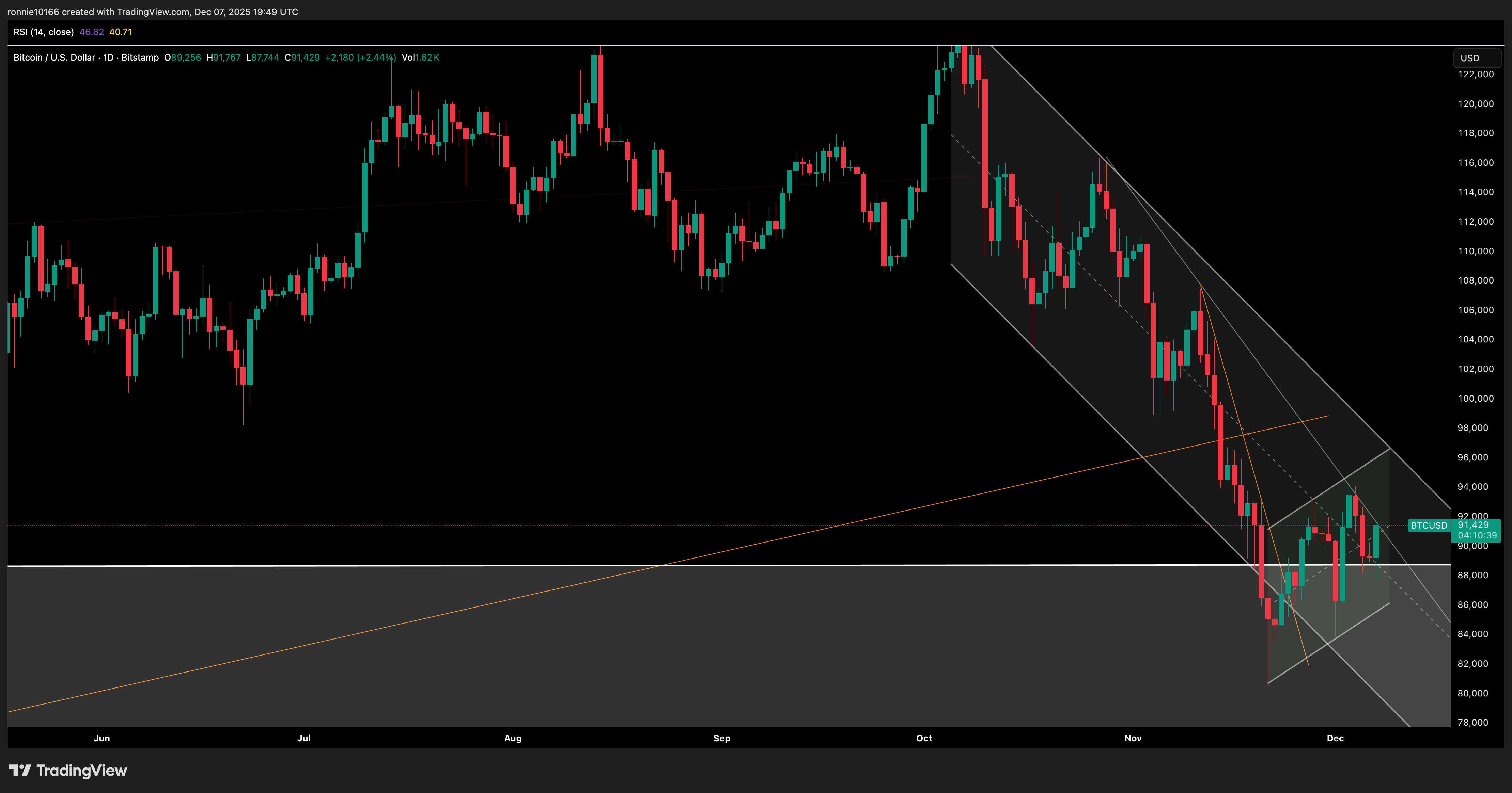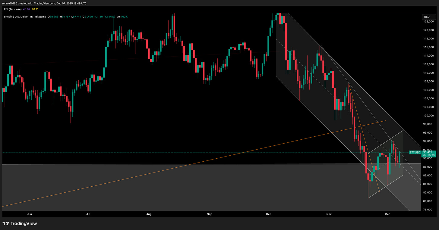 A third attempt to breach the buy zone, down to 75k, looks to have bounced off support. There’s downtrend resistance right here at 91.5k and then price needs to get over 94.1k for a run at 96.5k, the big target.