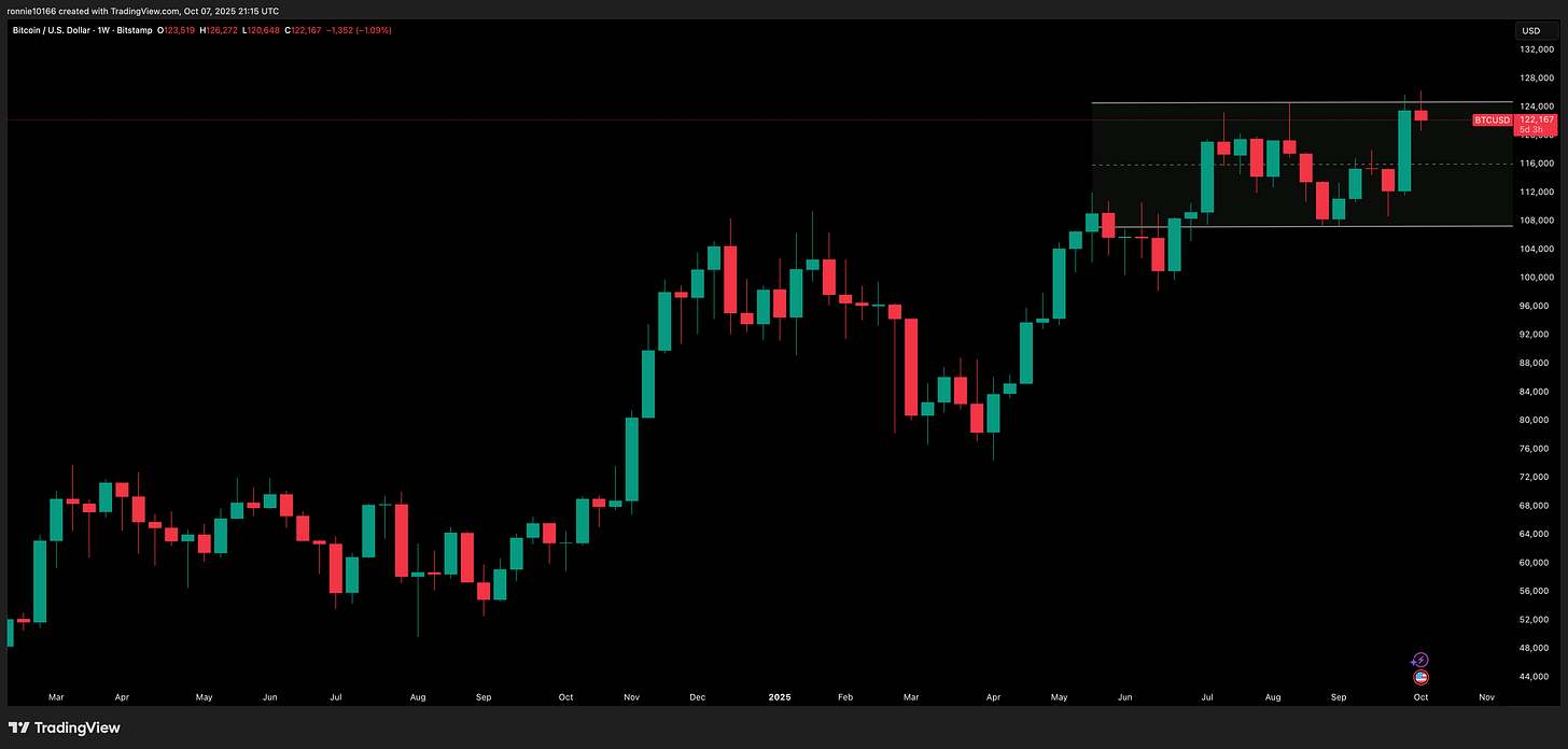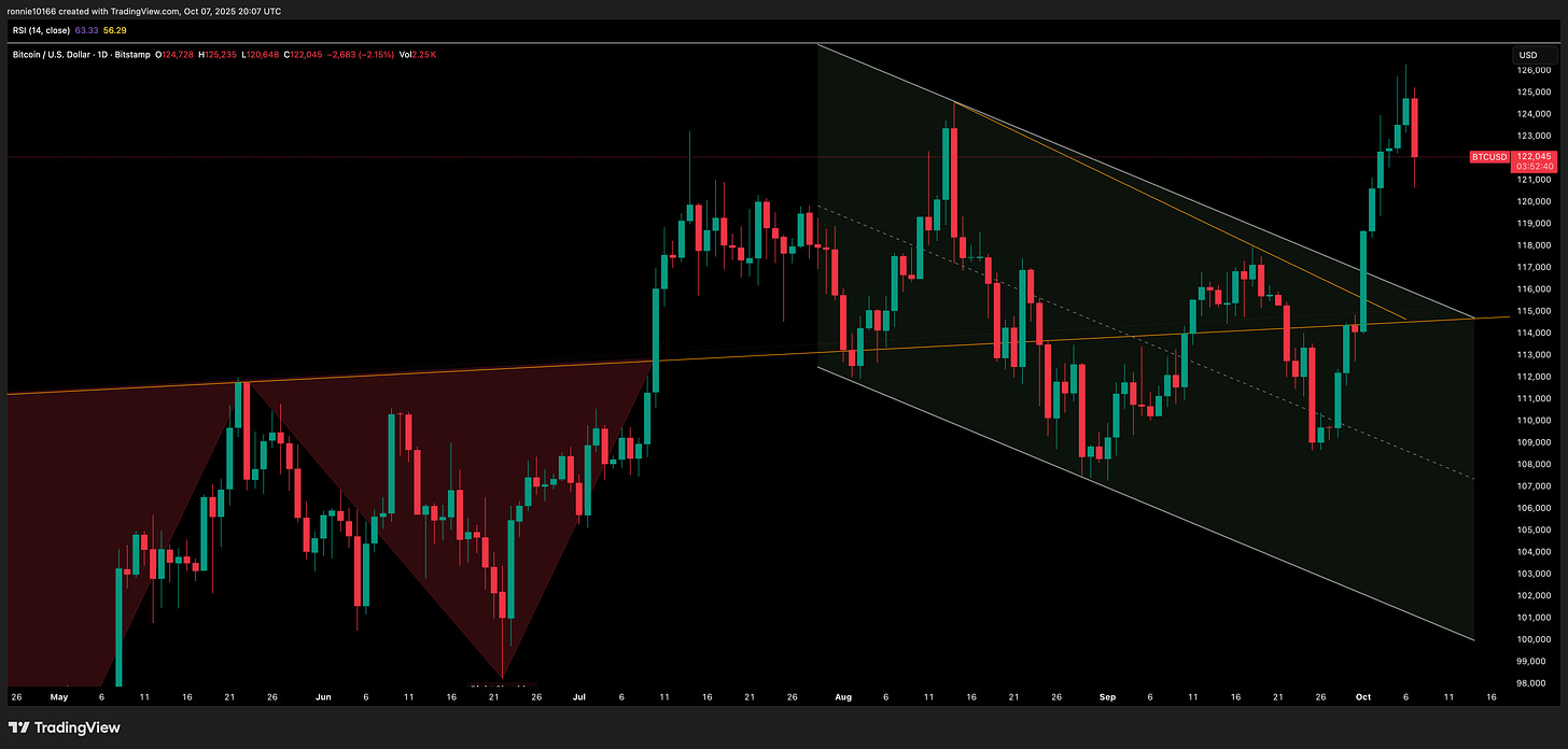 Bitcoin Update 8 October 2025Too much hopiumIan ReynoldsOct 07, 2025SharePrice needs to recover 123k today or we’ll be back down to 117k. In reality, weekly chart tells the story and price could go all the way back down to 108k.PreviousNext