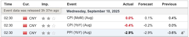 China's National Bureau of Statistics released its inflation data on September 10, 2025, covering August 2025. The Consumer Price Index (CPI) fell into deflation territory, declining faster than expected due to weak demand and volatile food prices. The Producer Price Index (PPI) showed signs of easing deflation, with the year-on-year drop narrowing for the first time in six months, aided by government efforts to curb price wars in industries like electric vehicles.
