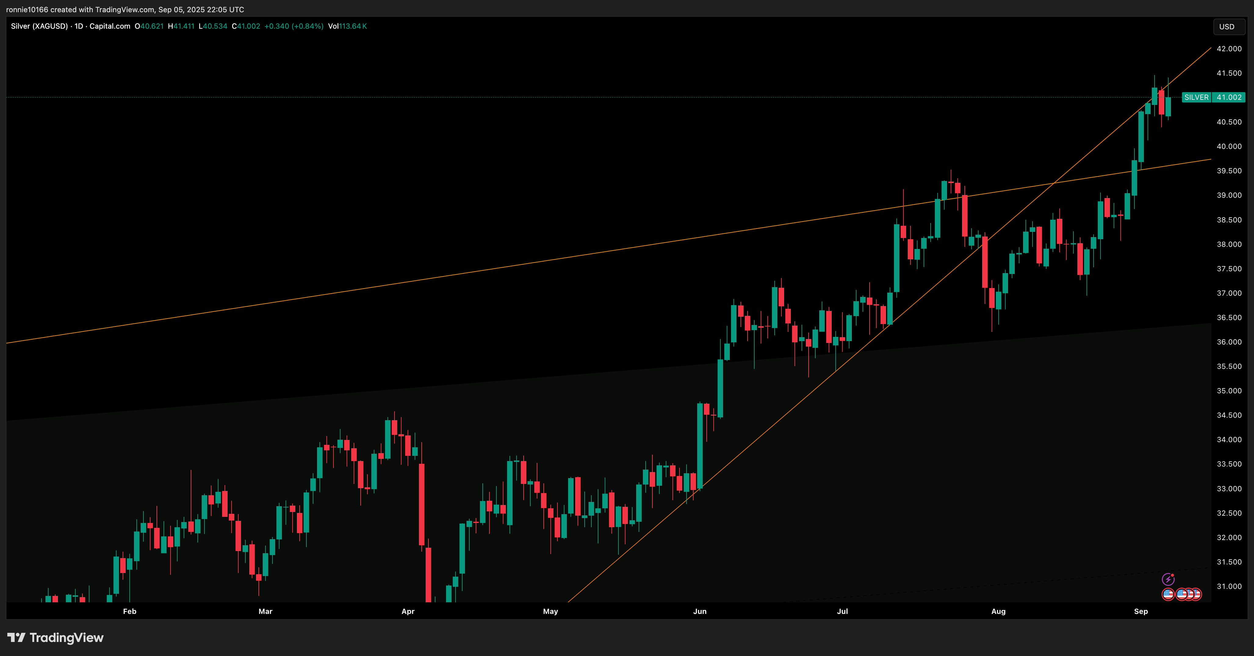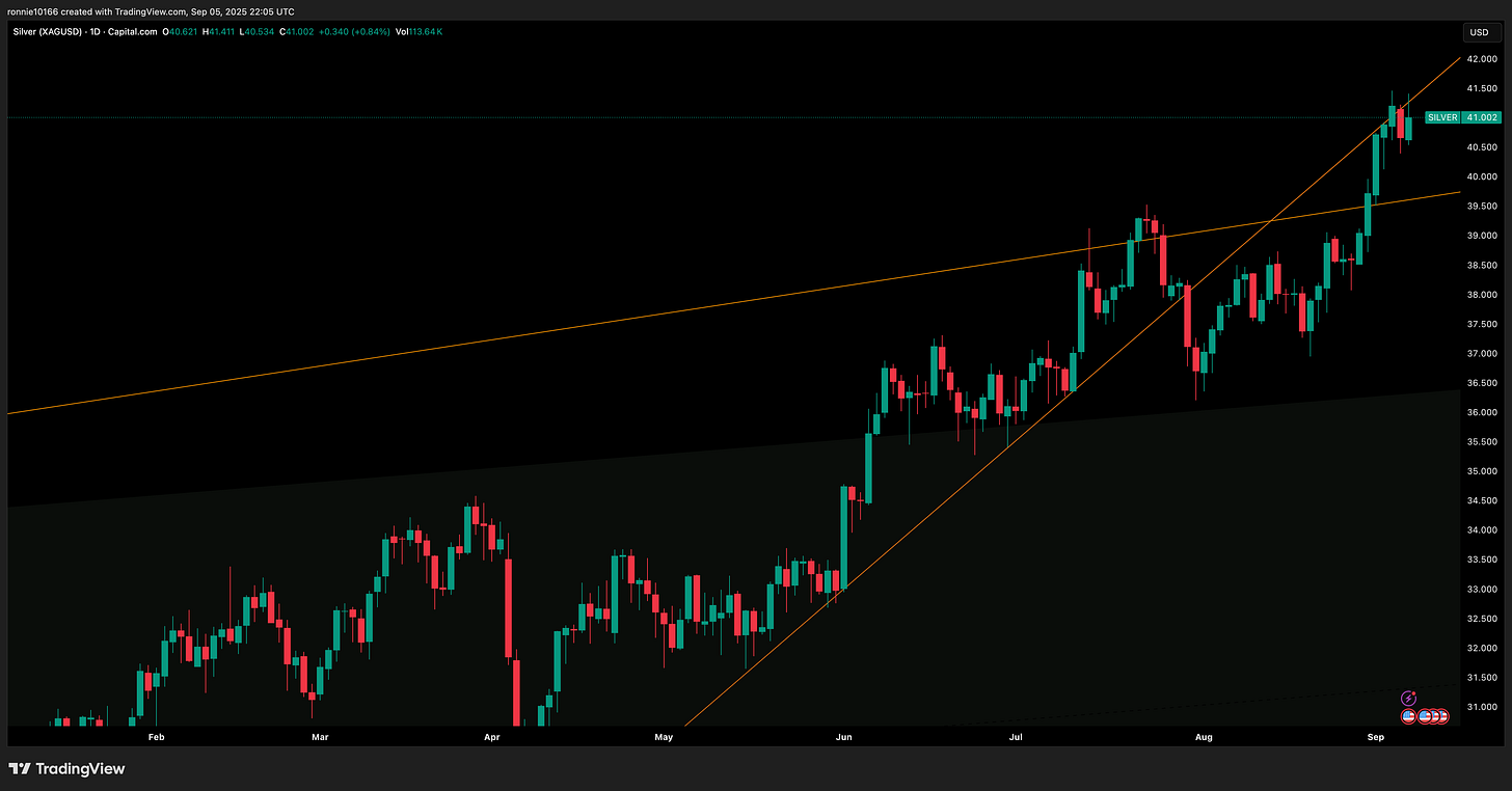 Silver hits $41 but pivot line still constraining price, a break above targeting $45.50 by measured move.