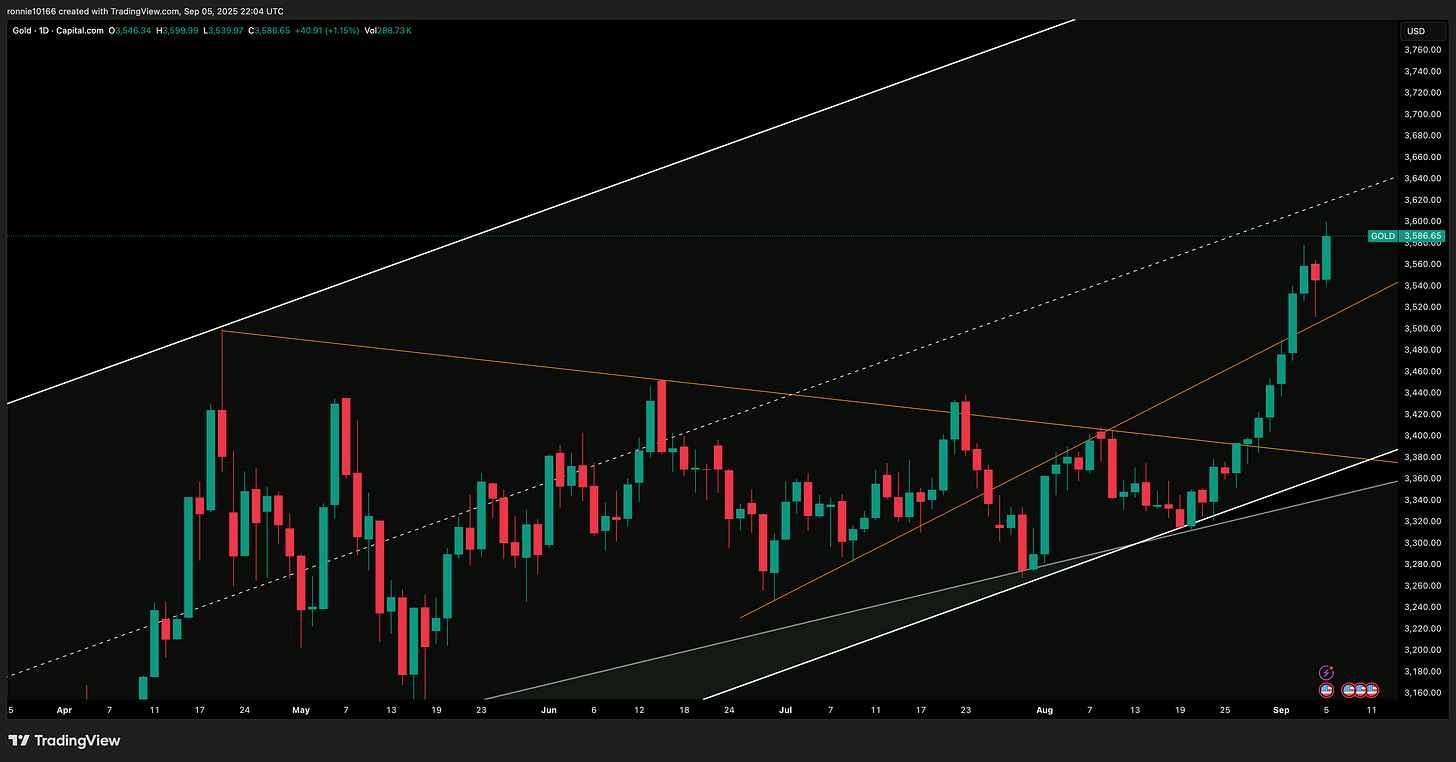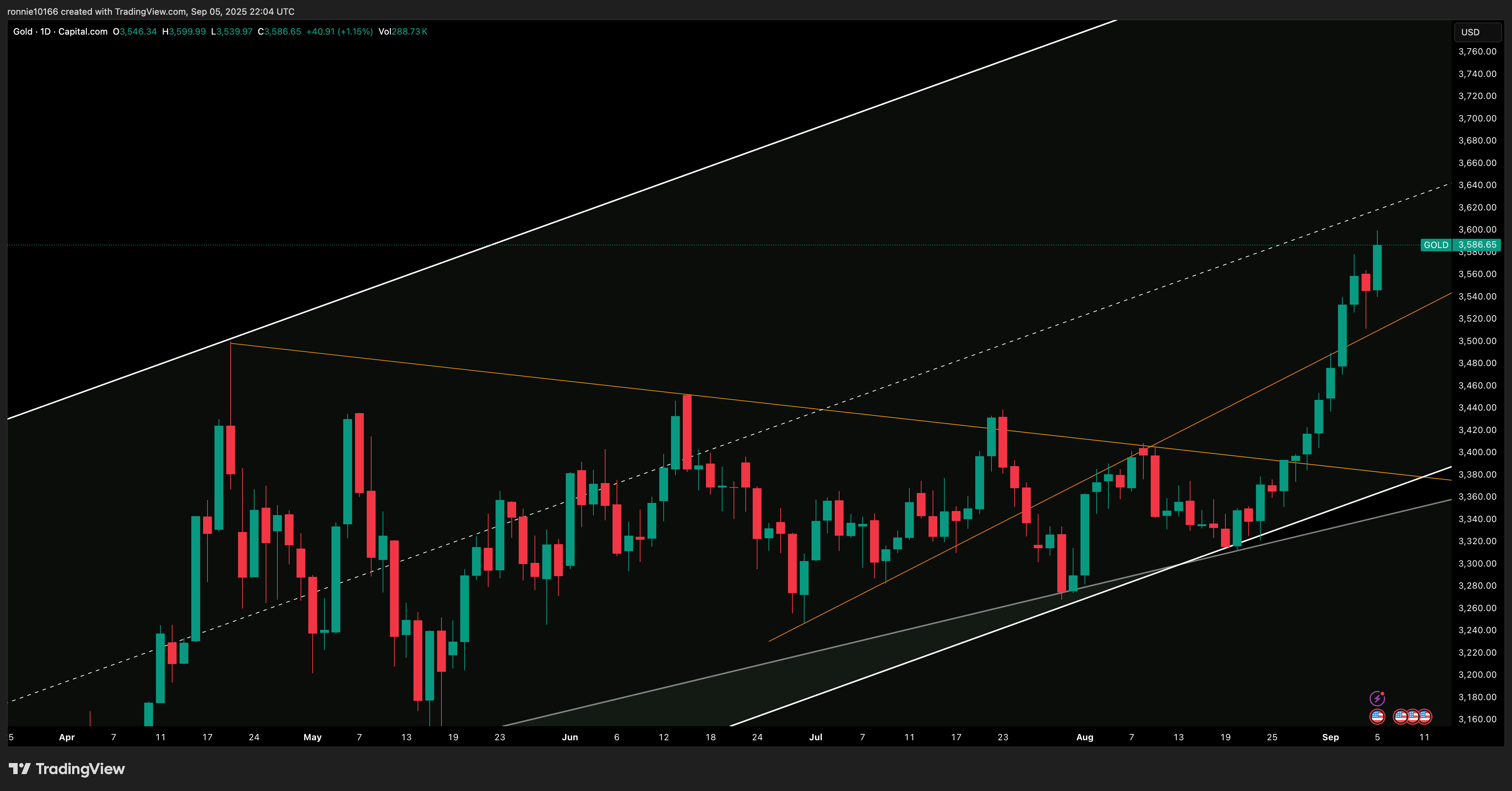 Gold makes a new all time high. Amazingly powerful trend, target 4,000 for the move to the top of the trend channel.