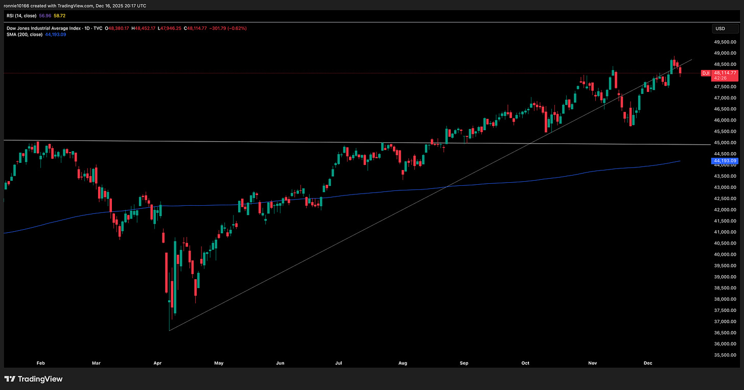 Dow Jones Update 17 December 2025Price couldn't confirmIan ReynoldsDec 16, 2025∙ PaidShareNo confirmation and a break back below the pivot line doesn’t look good for the DJIA. S&P and NASDAQ lower too but subdued price action.This post is for paid subscribersSubscribeAlready a paid subscriber? Sign inPreviousNext