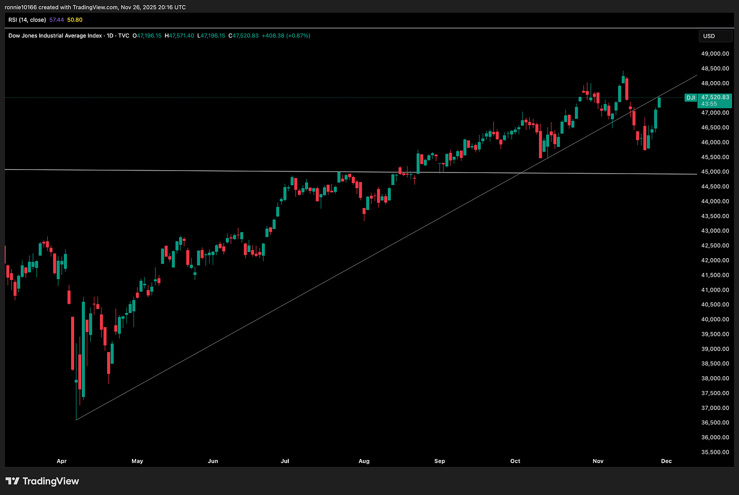 4 up days for US equity markets and we’re at the inflection point, beautifully demonstrated by the DJIA chart. Won’t see a resolution before next week and we’ll have to see what the market convinces itself of into the FOMC meeting on 10 December.
