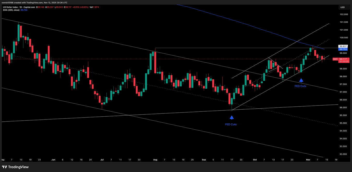DXY Update 13 November 2025Teetering on the brinkIan ReynoldsNov 12, 2025∙ PaidShareUSD looking weak, apart from USD/YEN of course. DXY looking to break lower as any rally doesn’t last long. Loss of 98.90 will see 98.10 pretty quick, setting up a move to the lows around 96.10.This post is for paid subscribersSubscribeAlready a paid subscriber? Sign inPreviousNext