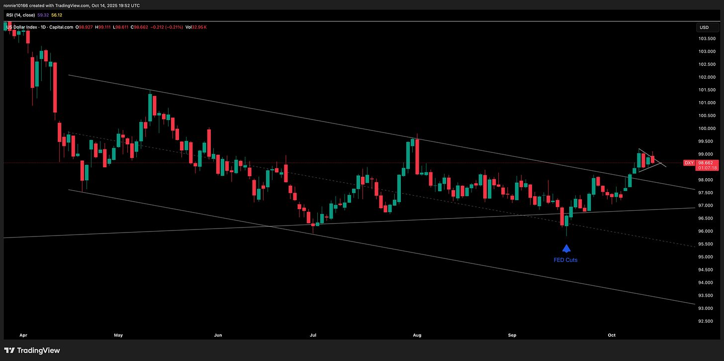 Yields are dipping but USD isn’t. I can’t help feeling that the momentum downwards in USD is over and price is suggesting a move up. With 2 rate cuts priced in already, what would be the reason for the USD to devalue further?