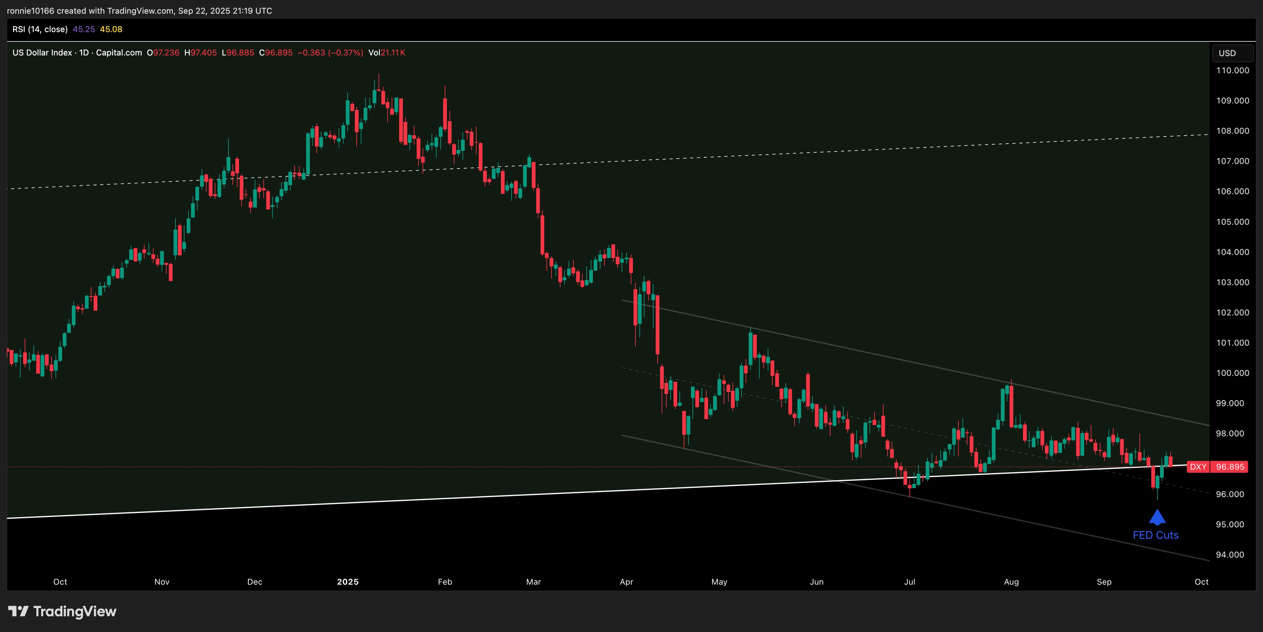 DXY Update 23 September 2025Market focusIan ReynoldsSep 23, 2025SharePrice didn’t confirm below 15 year trend line and yesterday’s action pulled back to the line at 96.80. DXY is the market mover currently so we look for guidance.Only PMIs out today so geopolitics could be price mover.PreviousNext