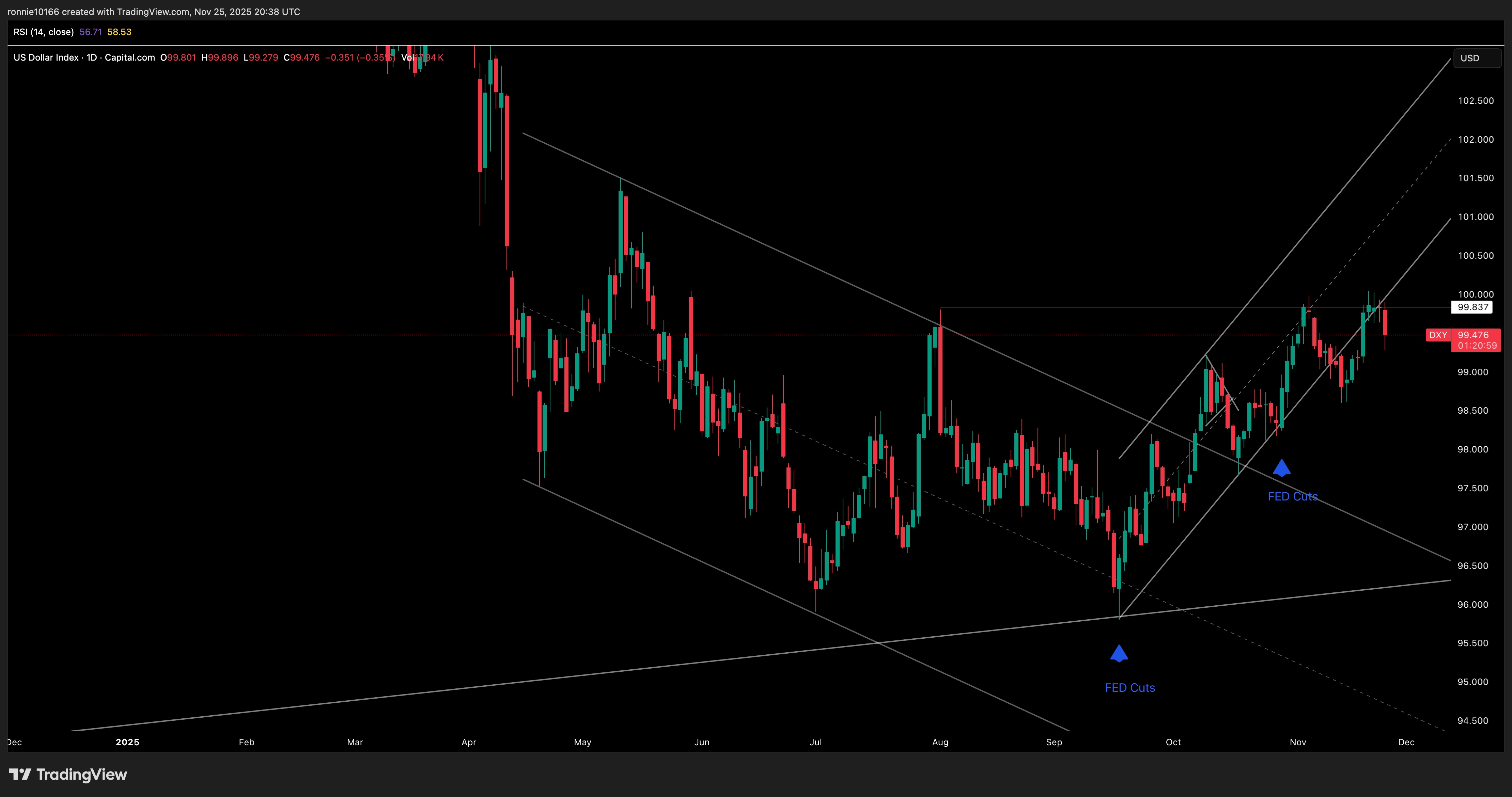 Short-term treble top now forming on DXY around 99.80 and a clear rejection of the level. Support is at 98.60 and 98.10 but I suggest we may well just trade a narrow range into Thanksgiving tomorrow and a quiet Friday.