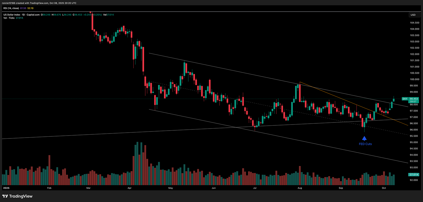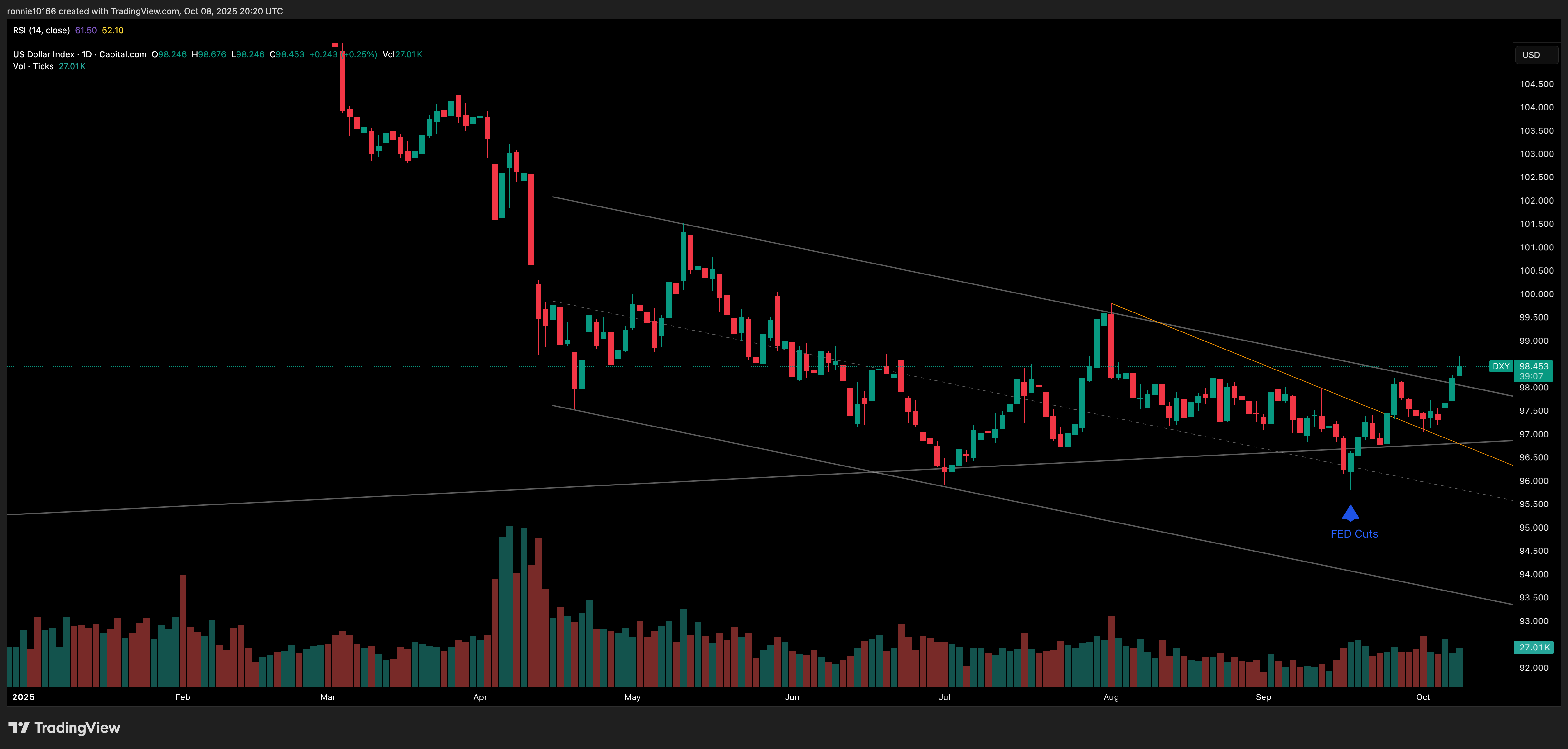 DXY Update 9 October 2025Break confirmed but low momentumIan ReynoldsOct 09, 2025∙ PaidShareBreak of short-term trend has been confirmed so looking for retest of 98.00 and then higher. This post is for paid subscribersSubscribeAlready a paid subscriber? Sign inPreviousNext