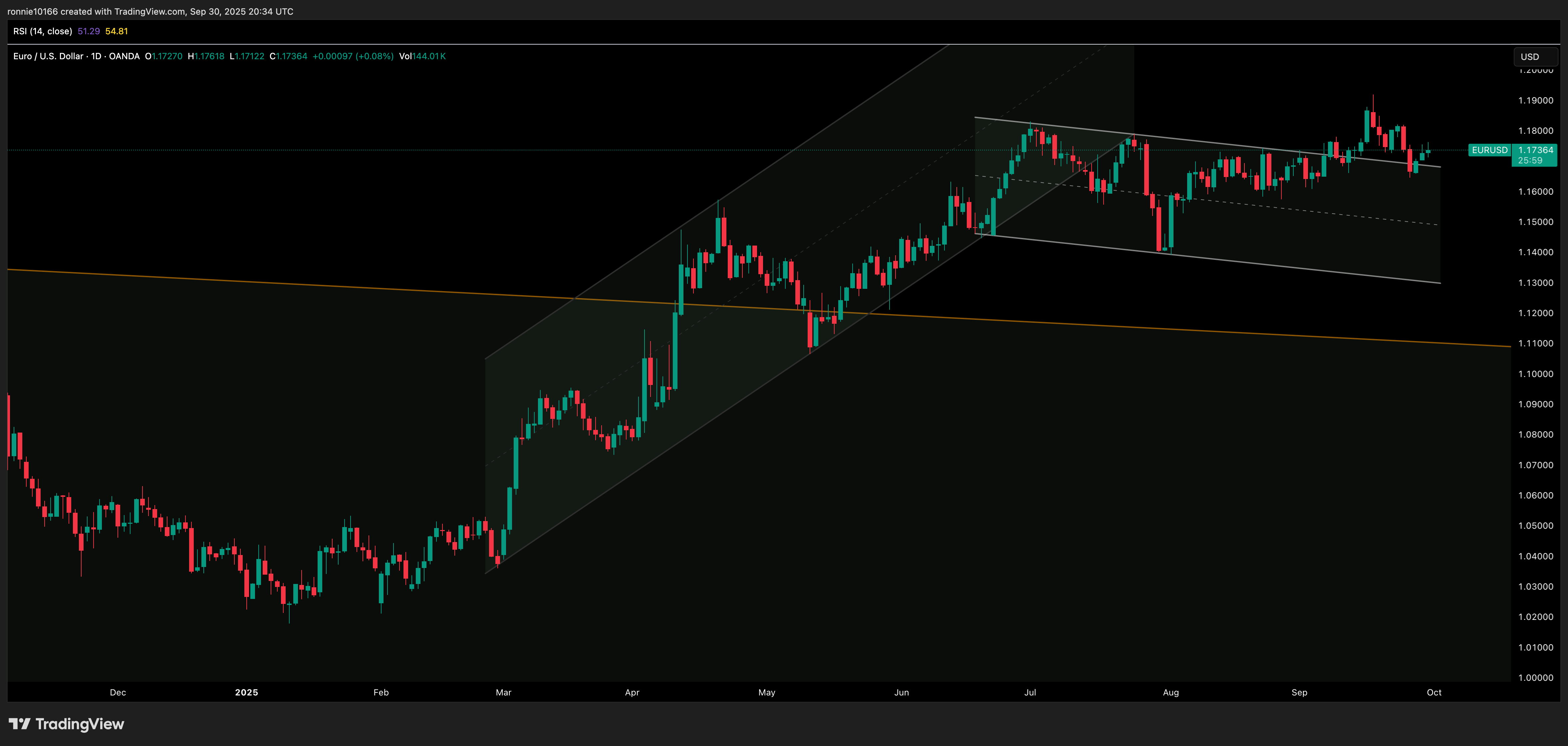 The previous low at 1.1650 is key support as a break below puts us back in the descending bull flag. The long wick from 17 September is still in charge and holding price down.