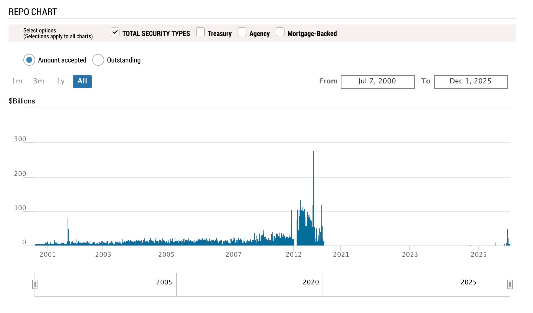 Better to worry about the FED’s Standing Repo Facility. We ignored the end of October higher short rates and increased Repo usage. However it does now appear to be becoming a consistent feature.