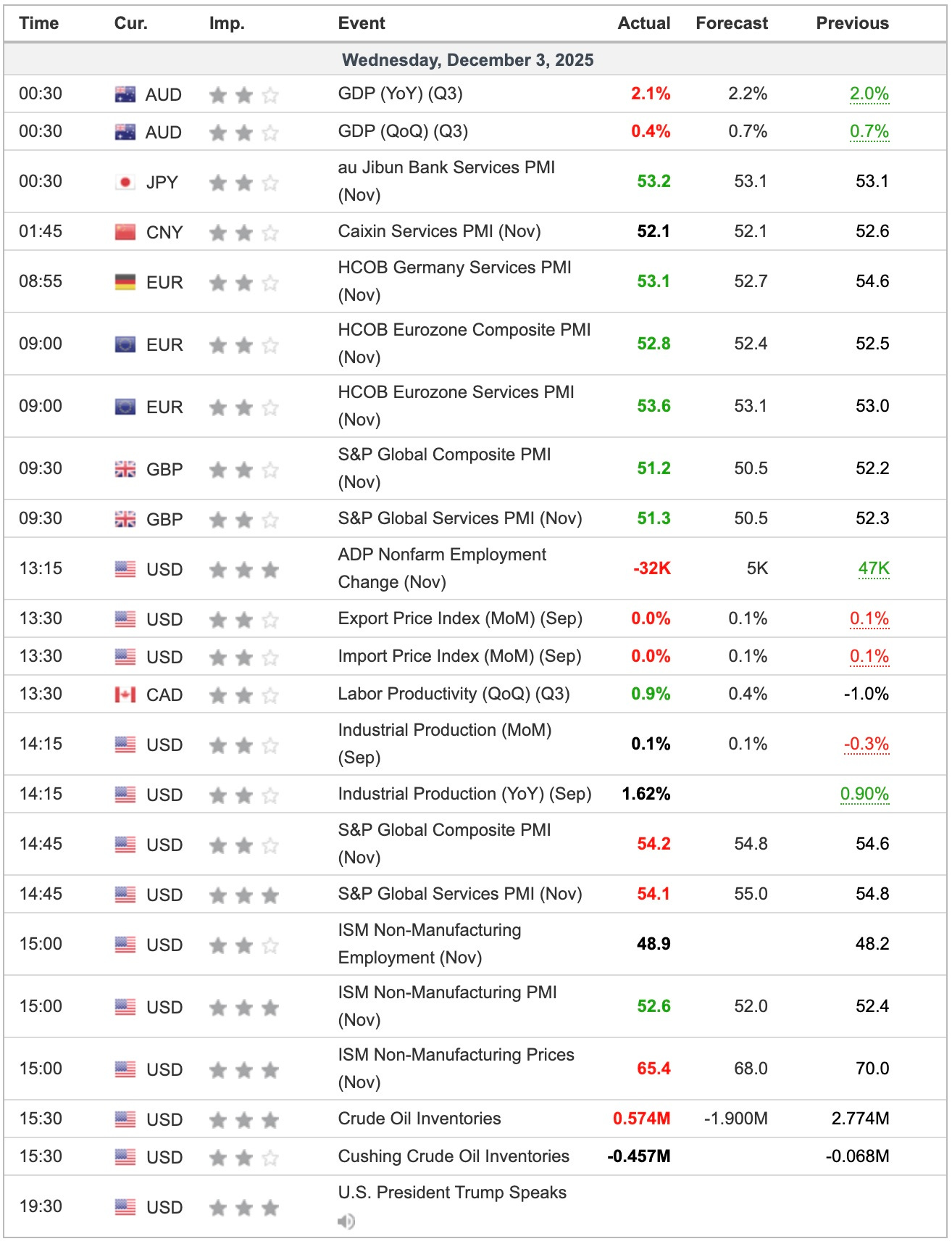 Australia’s GDP was sufficiently high, along with much too high CPI, to make a rate hike a statistical probability on Tuesday. US ADP was negative and with October’s Nonfarm Payroll cancelled, this is the number the FED will go with at the FOMC meeting on Wednesday. Added to zero import or export price increases (it’s almost impossible for that to be so) and ISMs and PMI negative, the chances of a rate cut are tending to 100%. Markets are bullish but cautious. Silver reached another all time high, but the real mover was the USD, which apart from USD/YEN, moved lower.