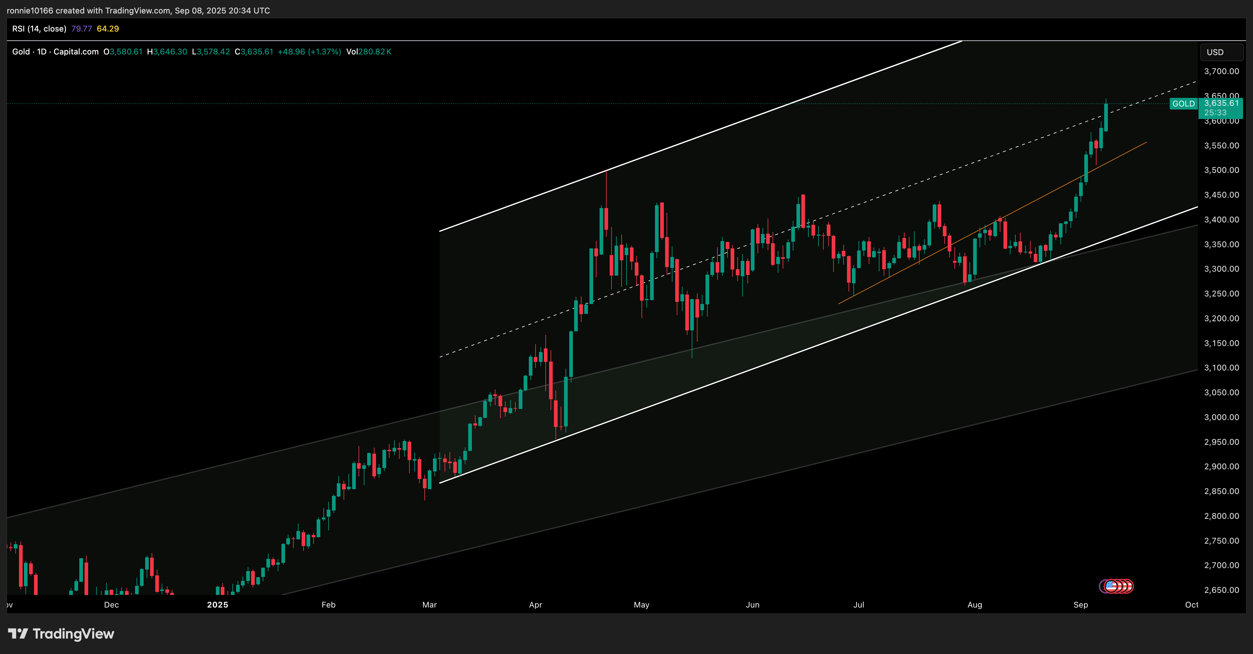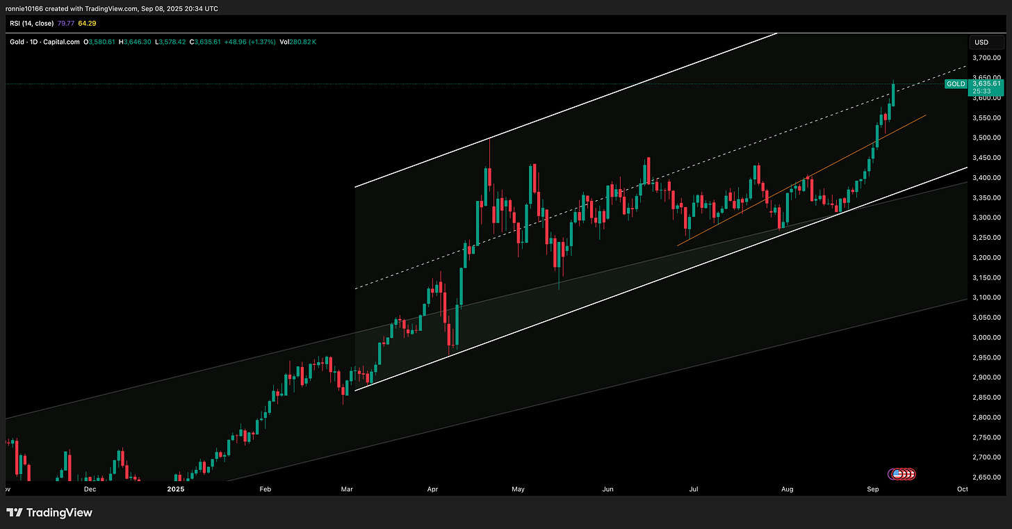 Gold UpdateNothing stops this trainIan ReynoldsSep 08, 2025ShareAmazing day yet again for Gold as we break the middle of the uptrend channel. These candles could get bigger.Support3,520Resistance3,875PreviousNext