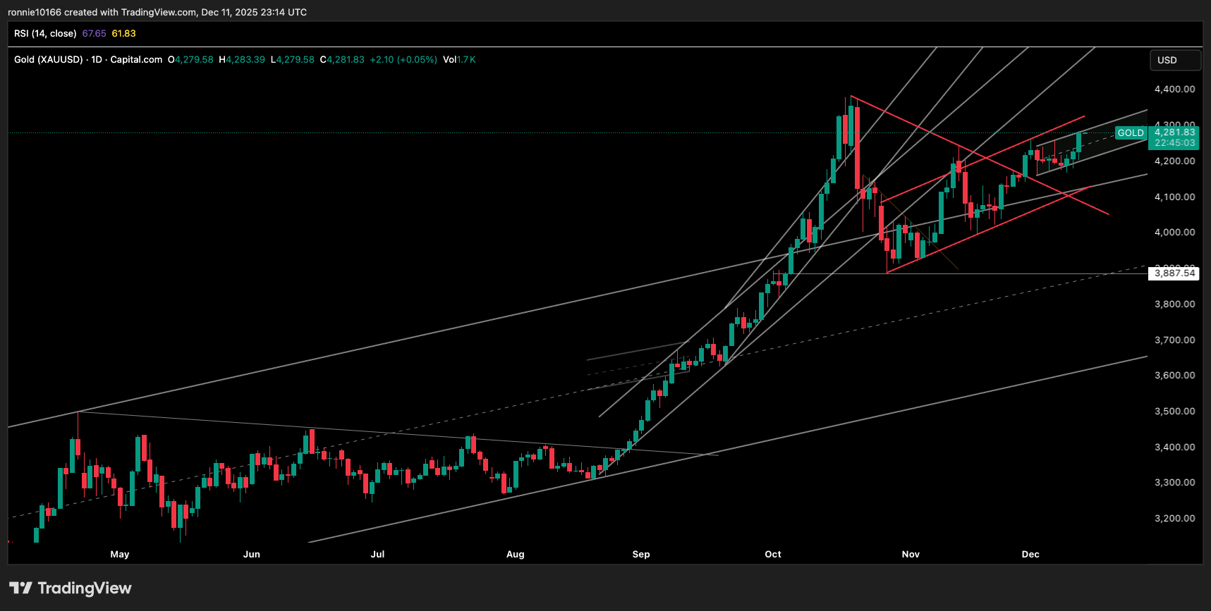 Gold Update 12 December 2025A bit of a mess.Ian ReynoldsDec 12, 2025∙ PaidSharePrice has moved back nicely to the top of the bull flag, but now faces a lot of resistance, a break of 4,290 and 4,325 can lead to a retest of the all time high at 4,380.This post is for paid subscribersSubscribeAlready a paid subscriber? Sign inPreviousNext