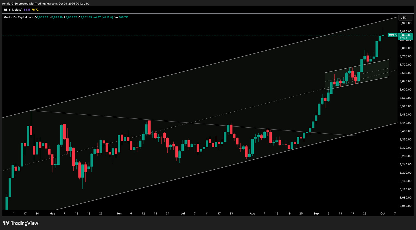We’d expect some consolidation here to give price the energy to spike to the top of the trend channel at 3,900 to 4,000. And the price does seem weary.