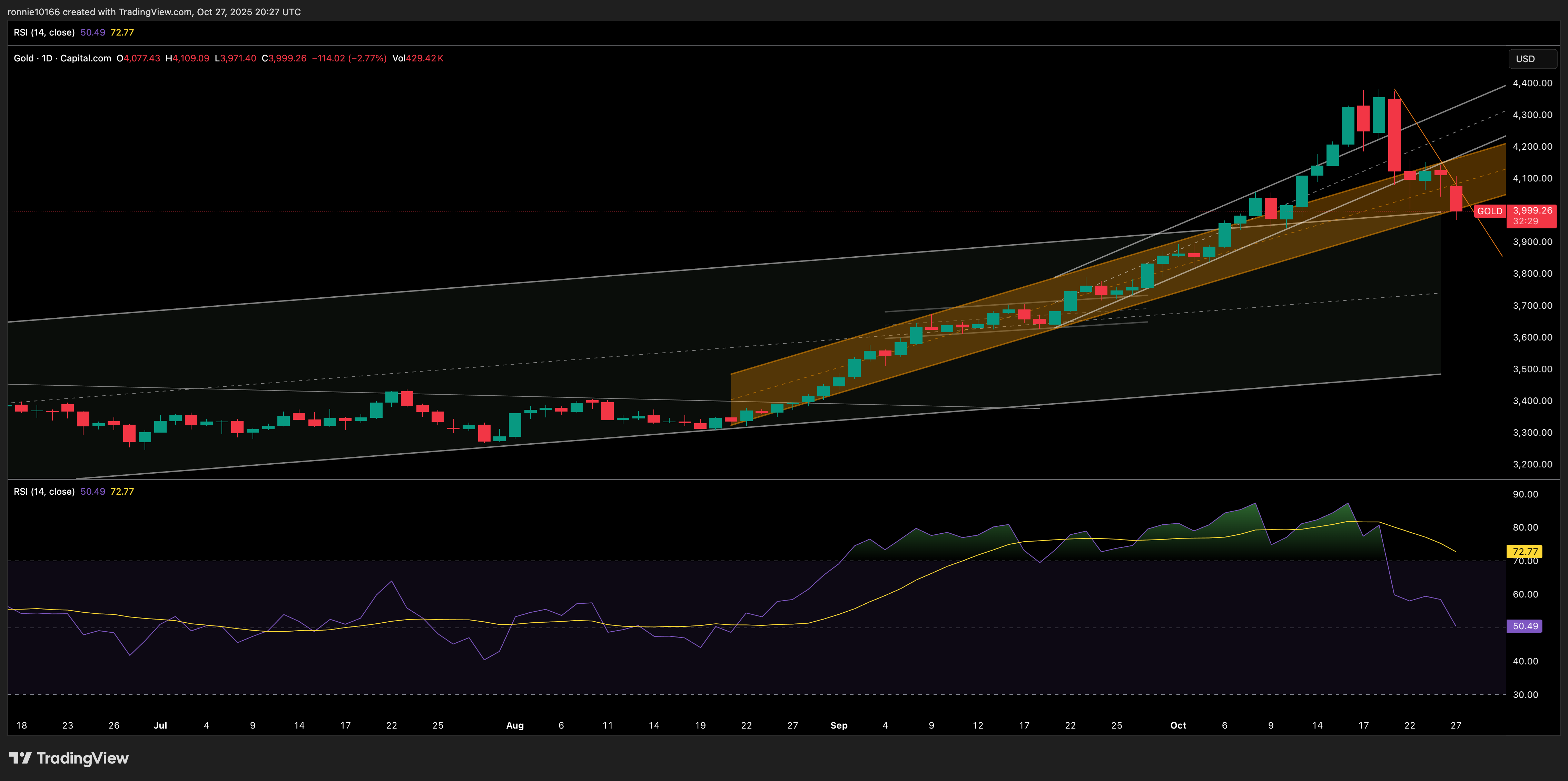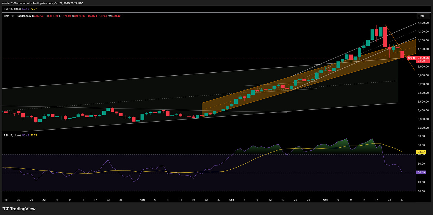 RSI has collapsed from 87 to 50 so now neutral. Price is now 4,000 rather than 4,380. The question is: are we still in a bull market? We think yes.