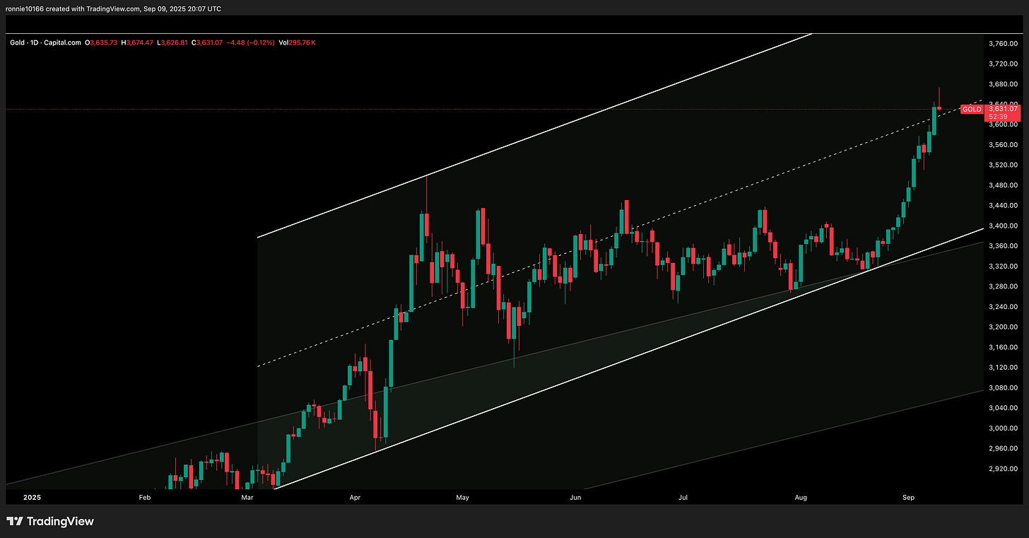 Gold UpdateShooting star spells end of the immediate trendIan ReynoldsSep 09, 2025ShareLooks like the strong trend up ends with the shooting star unless that gets changed in the next few hours. A consolidation is needed anyway before we try for the top of the channel. Could revisit $3,500 breakout from the previous all time high.PreviousNext