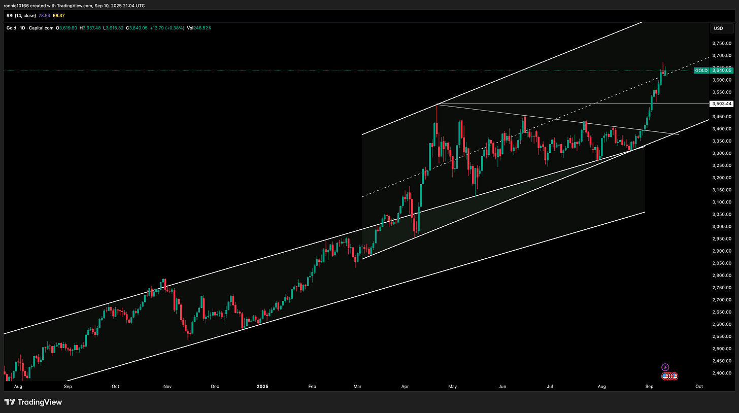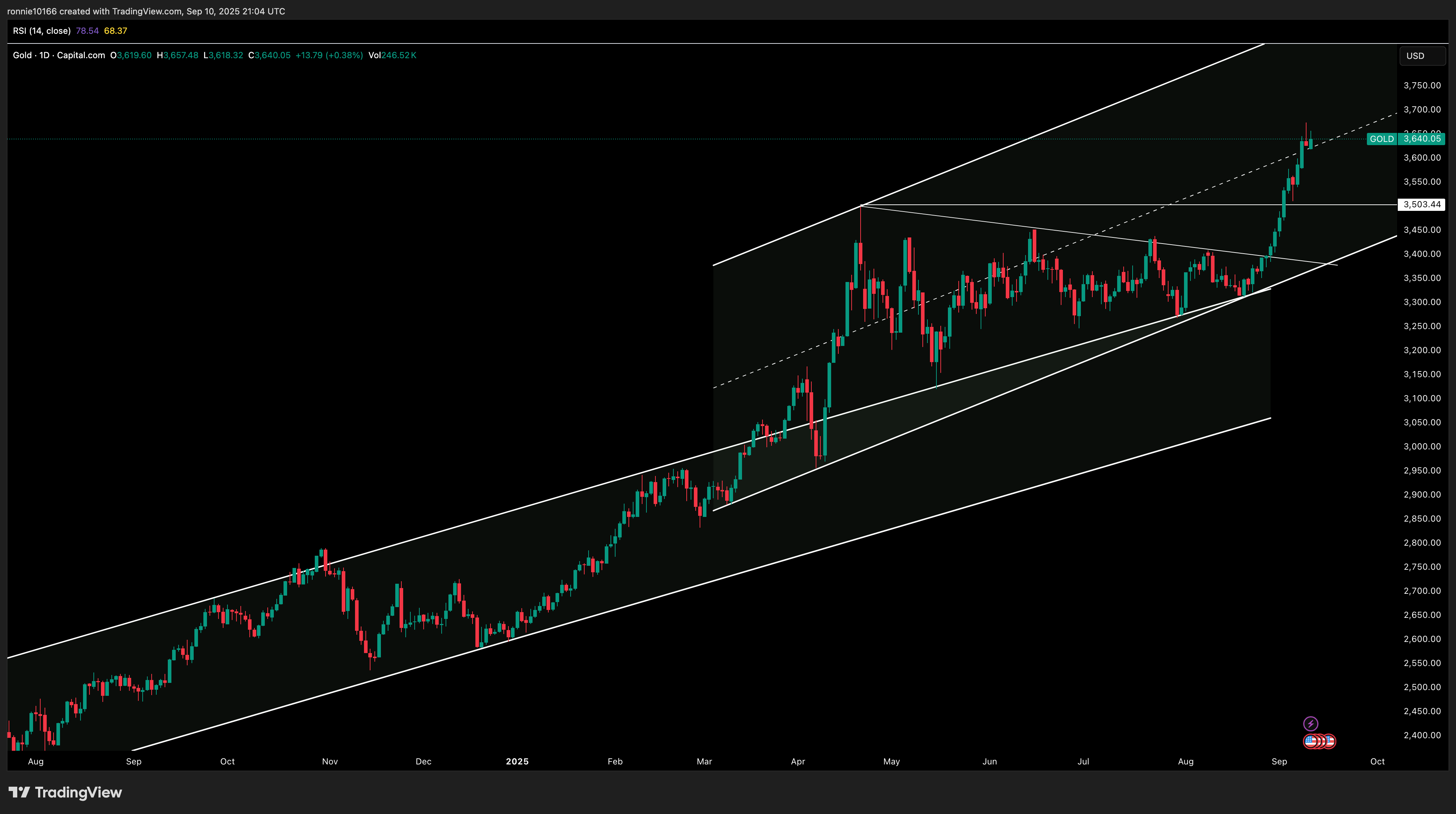Gold UpdateA good day but the consolidation is dueIan ReynoldsSep 10, 2025ShareGold advanced today but yesterday’s shooting star is the most powerful indicator and will keep price below 3,675 and will likely retrace to 3,500. A close and consolidation above 3,675 and 3,880 comes into play.PreviousNext
