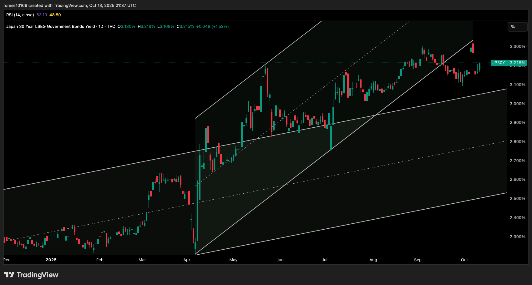 Japan 30 Year Yield Update 13 October 2025ChaosIan ReynoldsOct 13, 2025∙ PaidShareCharts are a complete mess as yield is between 2 channels and gapping up and down, seemingly at random.This could develop into a megaphone pattern.This post is for paid subscribersSubscribeAlready a paid subscriber? Sign inPreviousNext