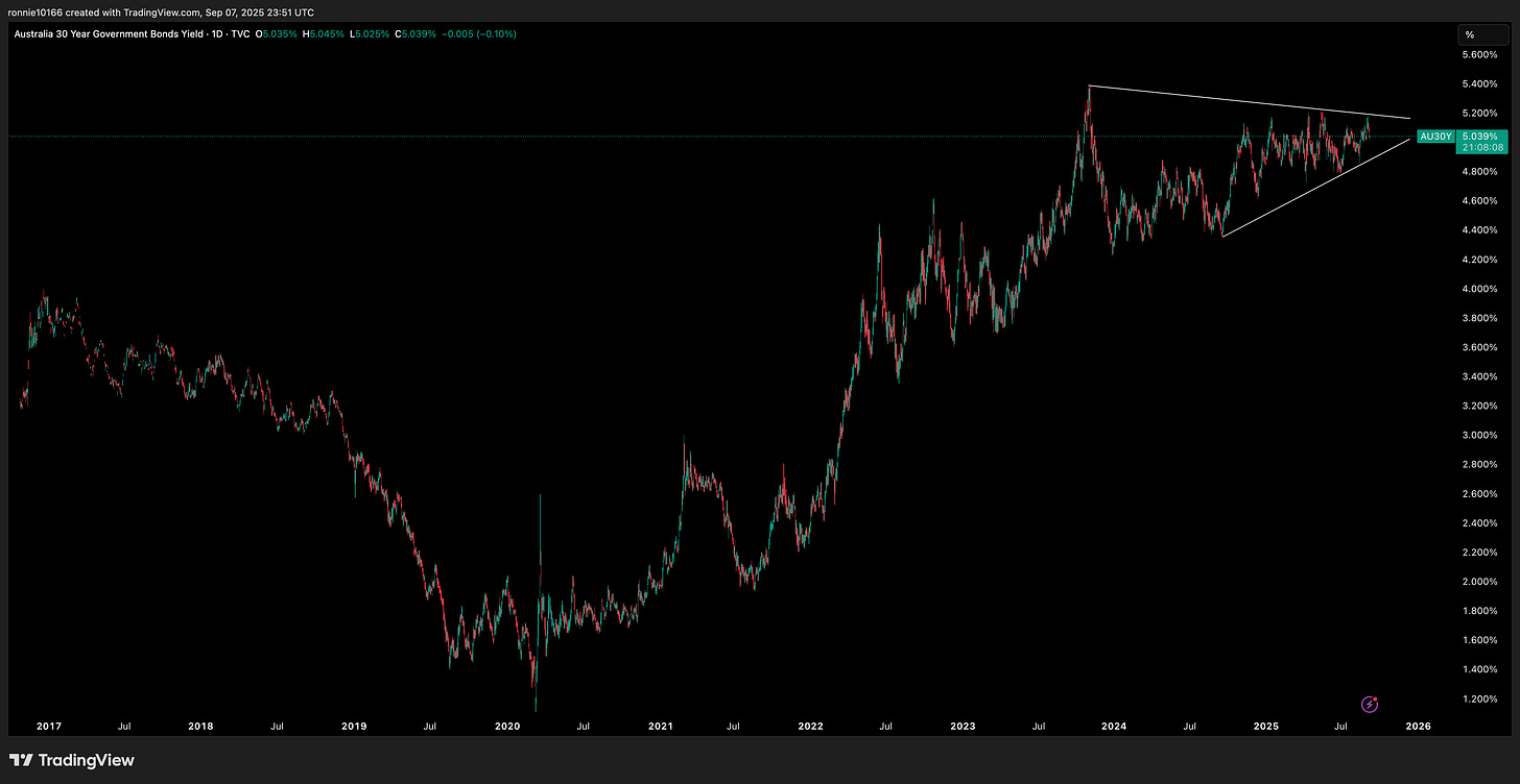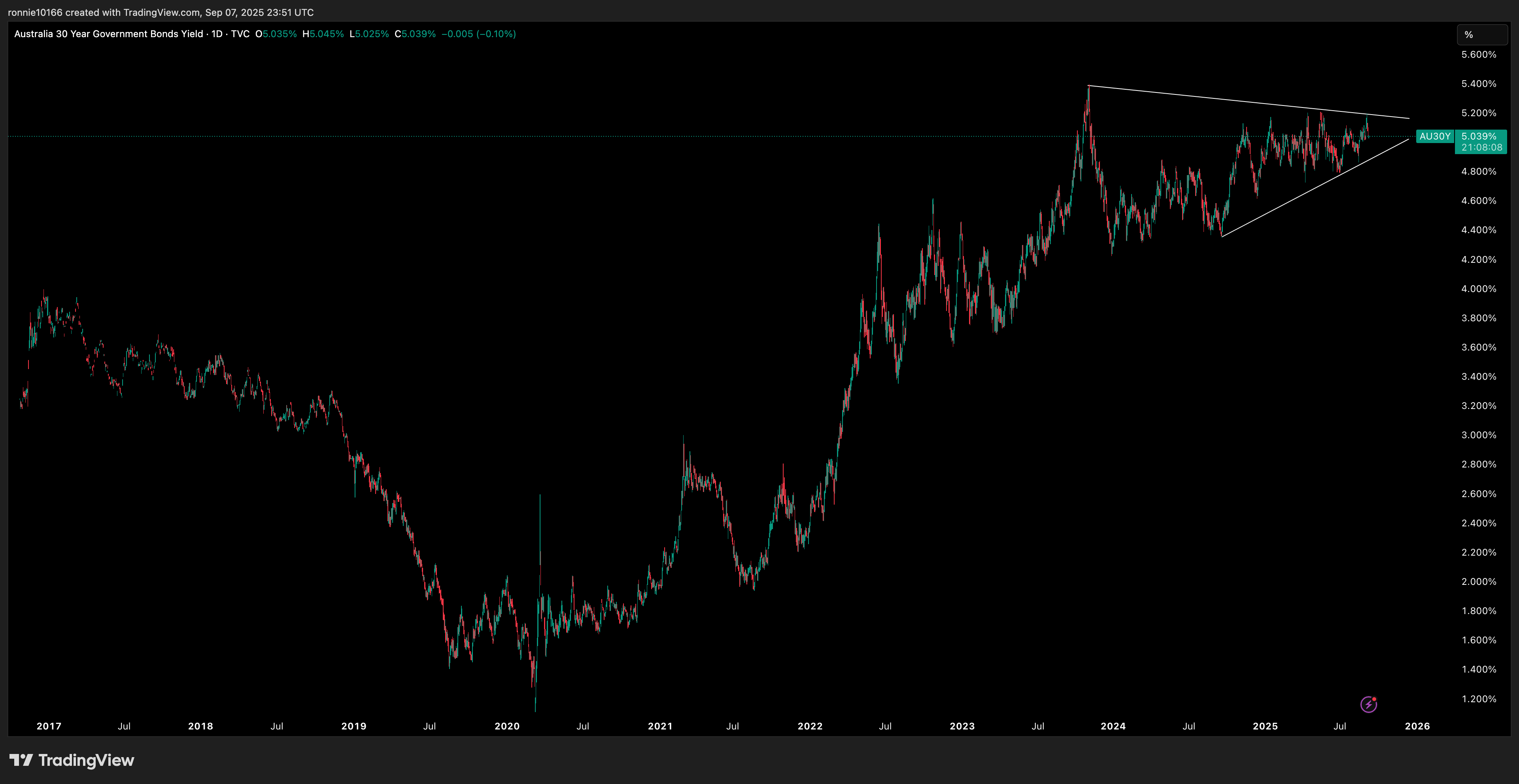 A big rally in bonds, drop in yields, across the board on Friday but Australian yields not so much, and nearly 2% higher than 10 years ago. In line with AUD/USD looking to break a 15 year resistance, there is a good trade about to appear.