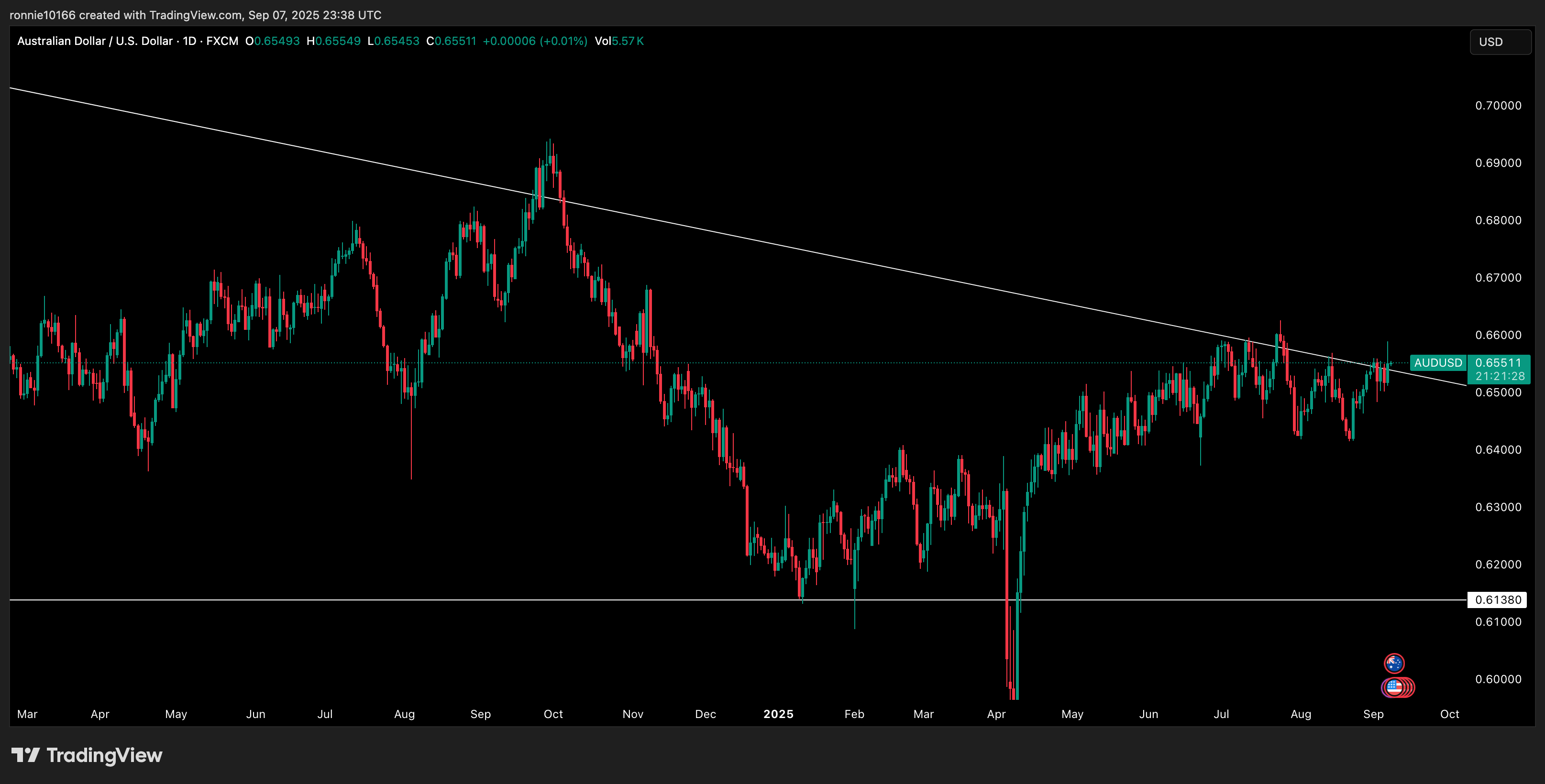 Aussie breaking higher but after 15 years price has pierced the trend-line many times. Price confirmation and pull back to the scene of the crime is the tactic here.