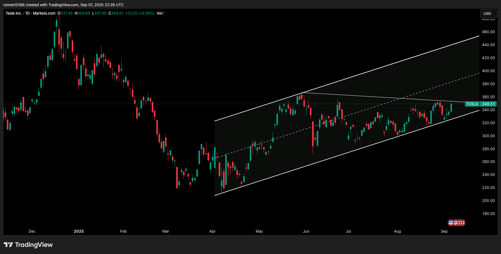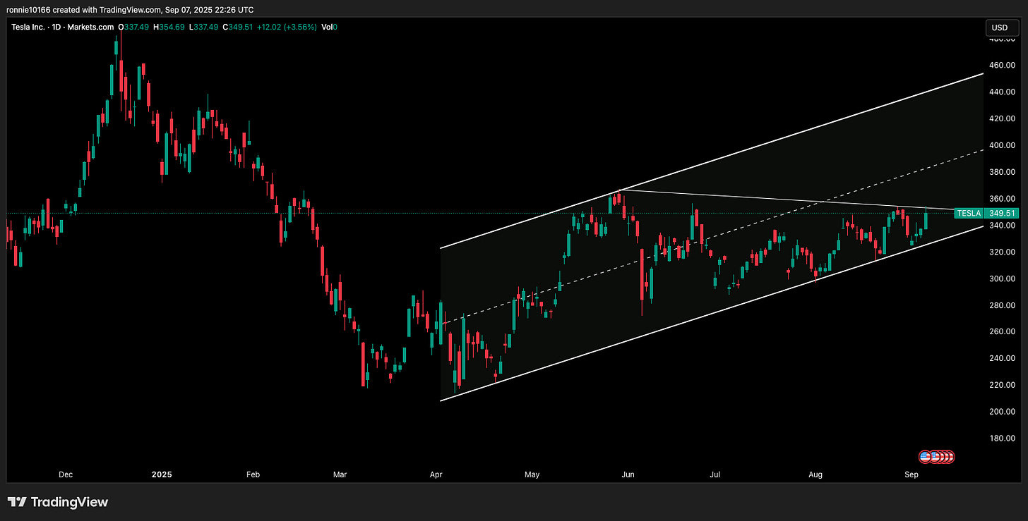 Tesla at short-term resistance. Plenty of bad news/hating but yet again it keeps crawling along the bottom of the channel. There's a $100 per share opportunity coming up.