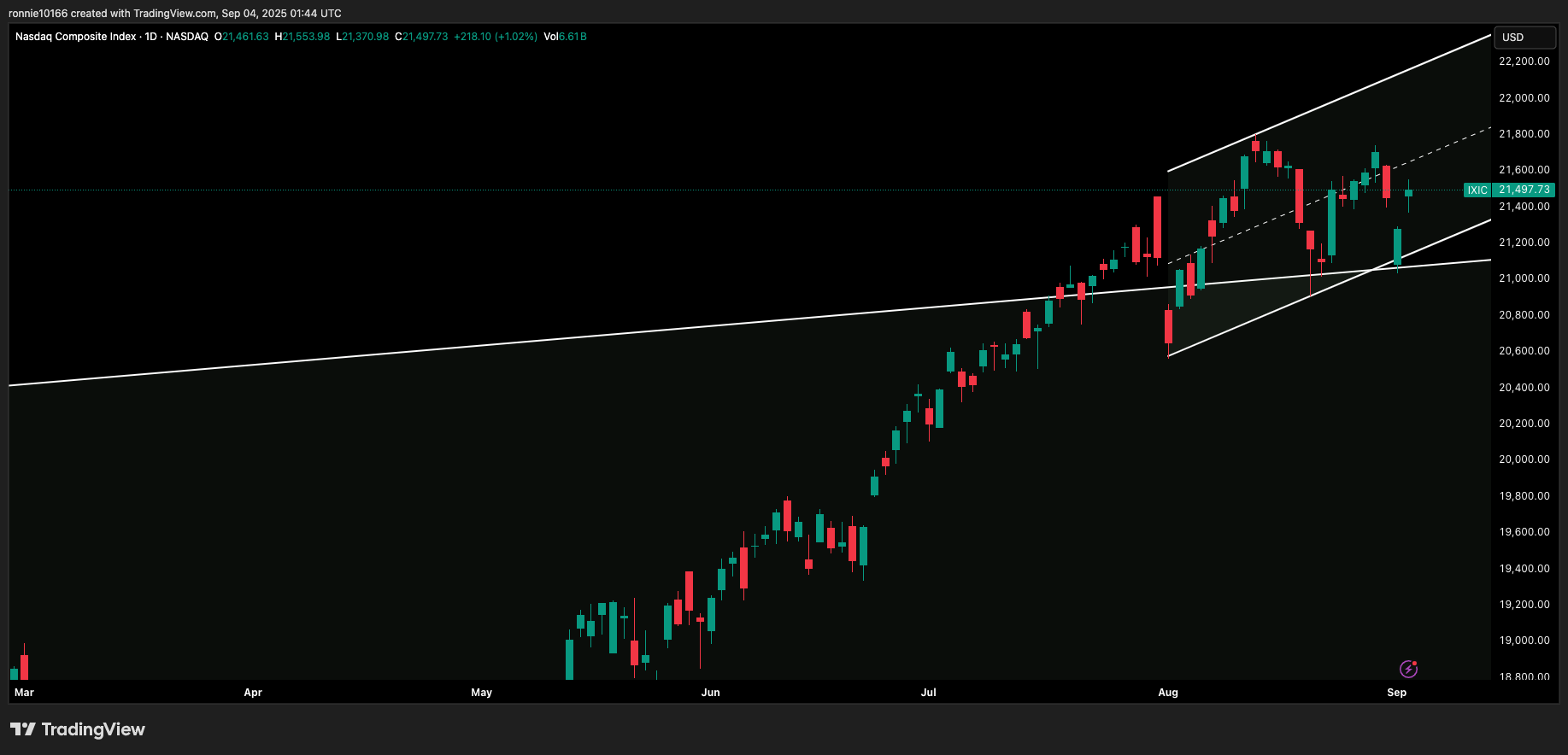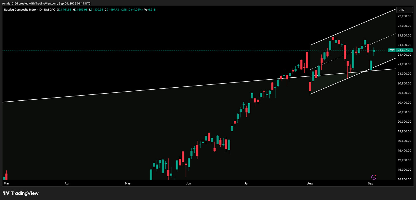 NASDAQ Back On The RailsIan ReynoldsSep 04, 2025ShareGap up and rally for the NASDAQ. We've rescued the case for continuation of the bull market. Just.PreviousNext