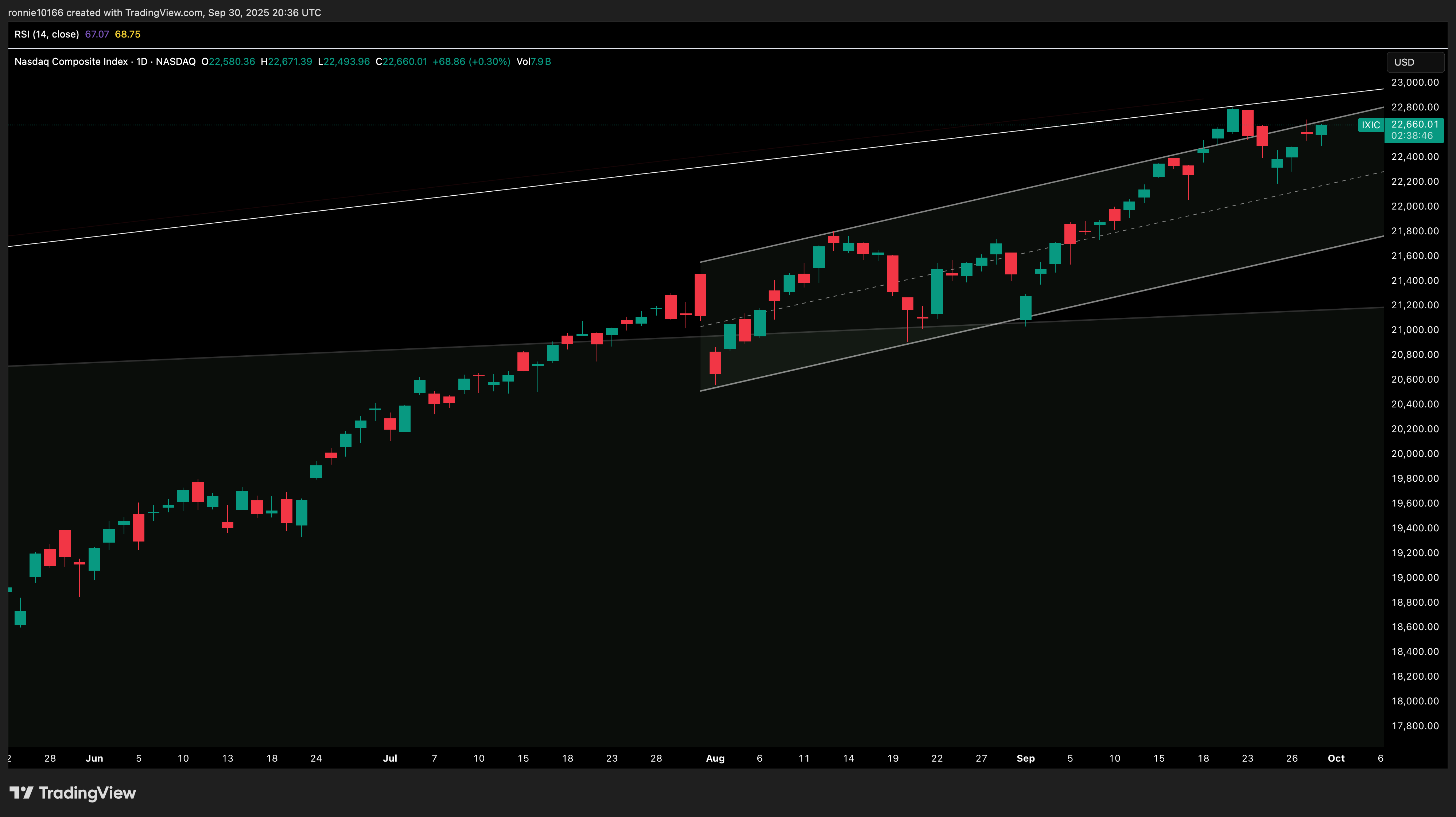 NASDAQ Update 1 October 2025And still it risesIan ReynoldsSep 30, 2025∙ PaidShareA small blip and we’re pushing into resistance again. That converging wedge is going to deliver a massive move in the next 2 weeks. Below 20,550 and we’ll be dusting off the Fib Retracement ToolThis post is for paid subscribersSubscribeAlready a paid subscriber? Sign inPreviousNext