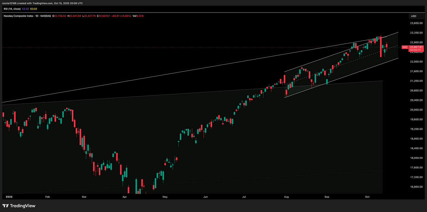 NASDAQ Update 16 October 2025Undecidedly uncertainIan ReynoldsOct 15, 2025ShareNot much to go for on the NASDAQ. Price is rangebound. All background says price should rise: FED will cut, QT is ending, maybe QE on the way. Powell saying tightened economic conditions is the excuse to fire all the guns. But price is still here.PreviousNext