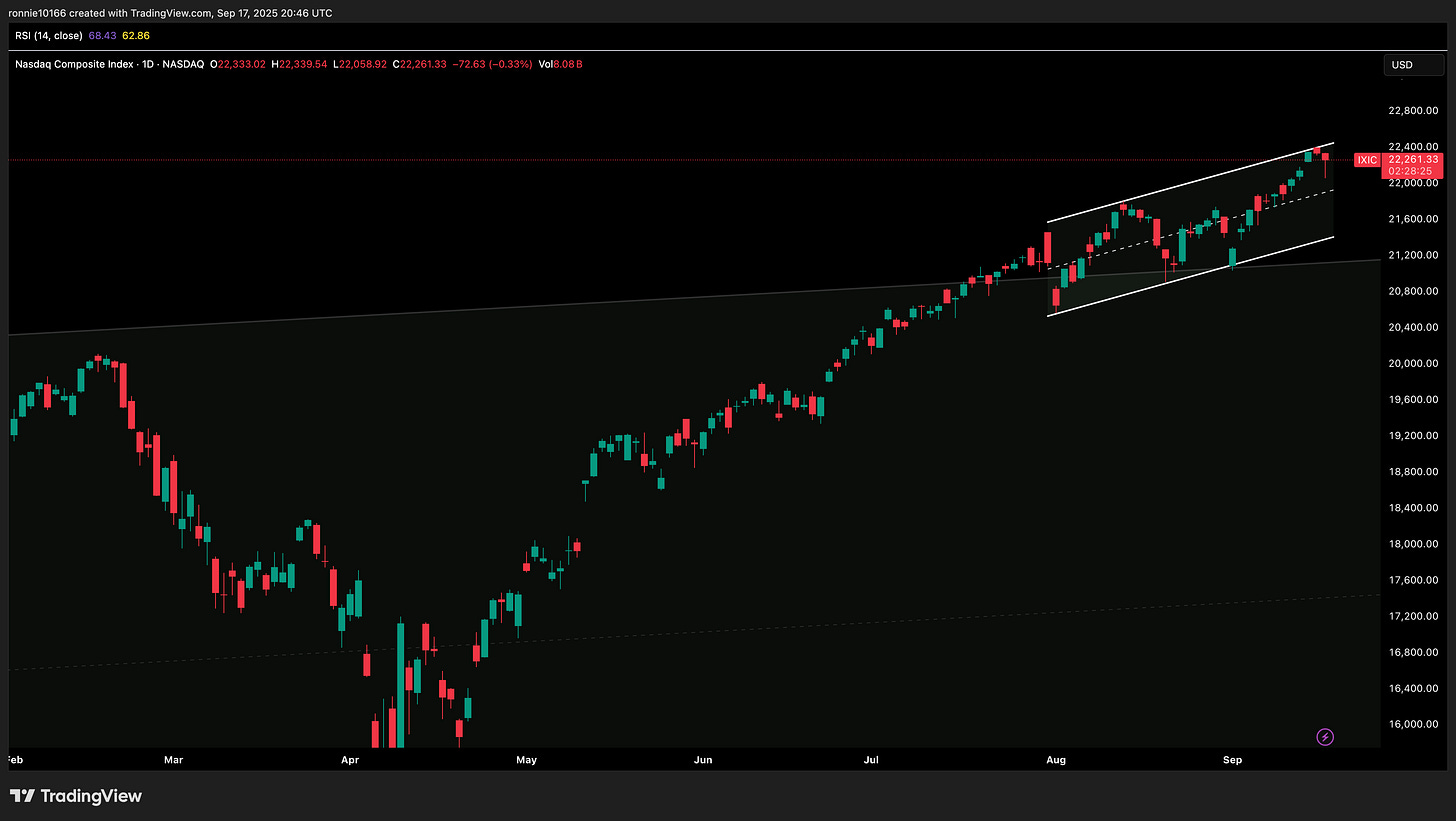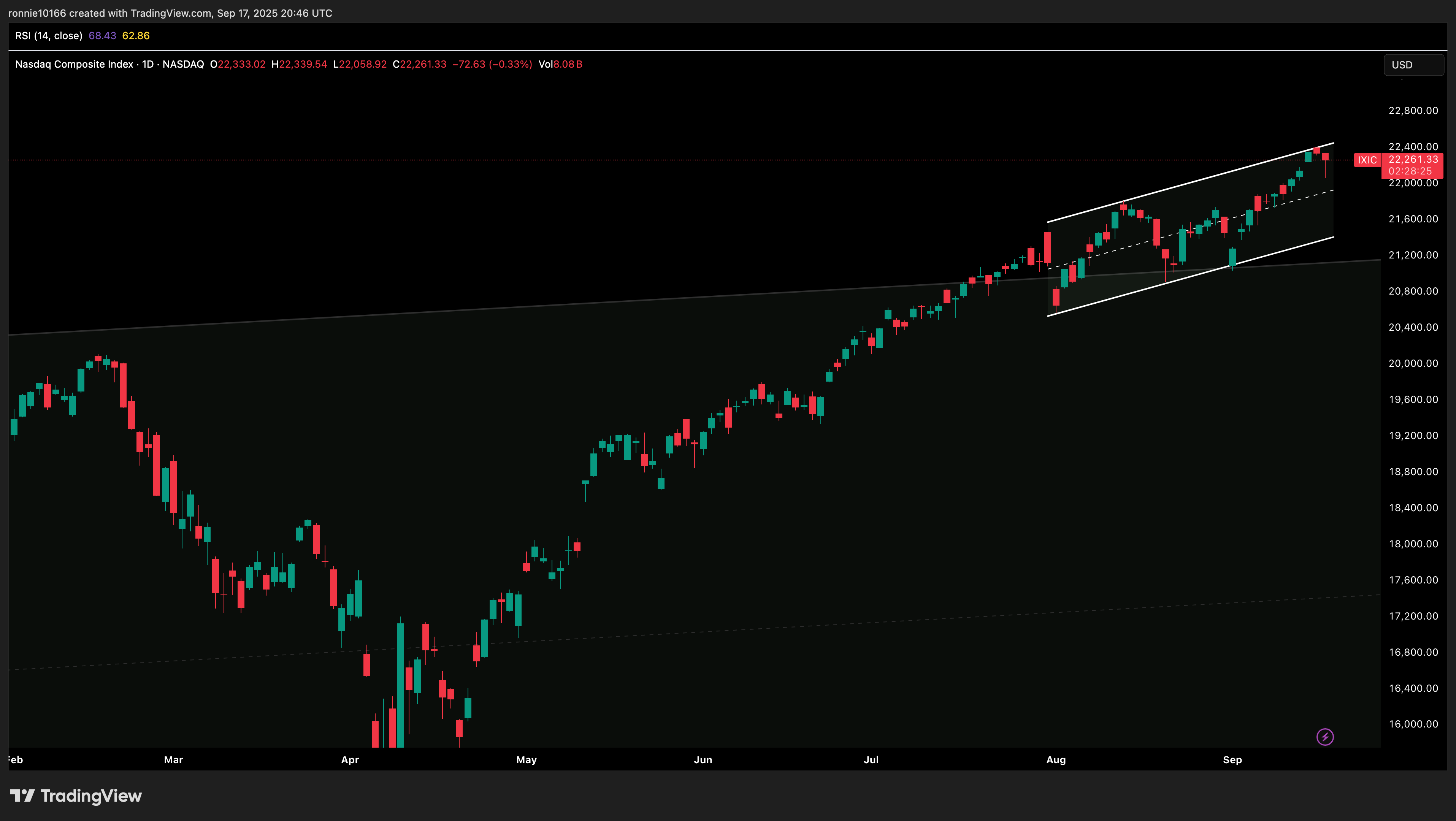 NASDAQ Update 18 September 2025Nothing stops this trainIan ReynoldsSep 17, 2025ShareThis short-term trend seems to be playing out nicely. Little volatility, VIX was down 4% yesterday, and nothing to stop retail buying the dip. PreviousNext