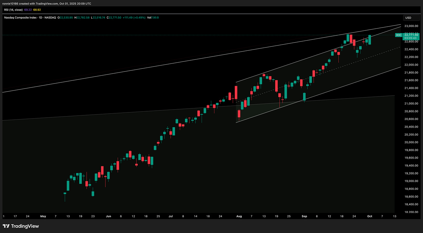 NASDAQ Update 2 October 2025Back into the wedgeIan ReynoldsOct 01, 2025∙ PaidSharePrice trying to get back into the wedge, ready for an epic conclusion in the next week or so.A close below 22,200 would see us work down to 20,500 and then finding support around 20,120, the consistent trading range from December to February. This post is for paid subscribersSubscribeAlready a paid subscriber? Sign inPreviousNext