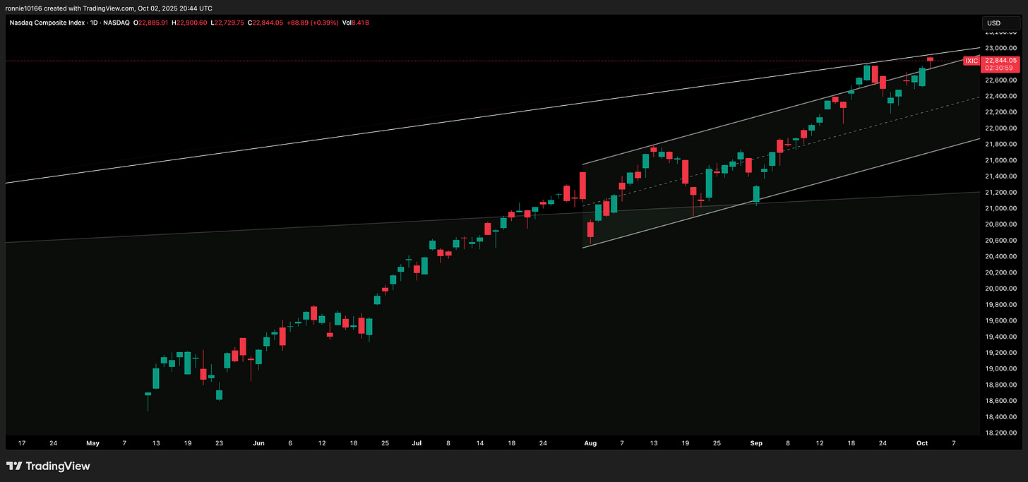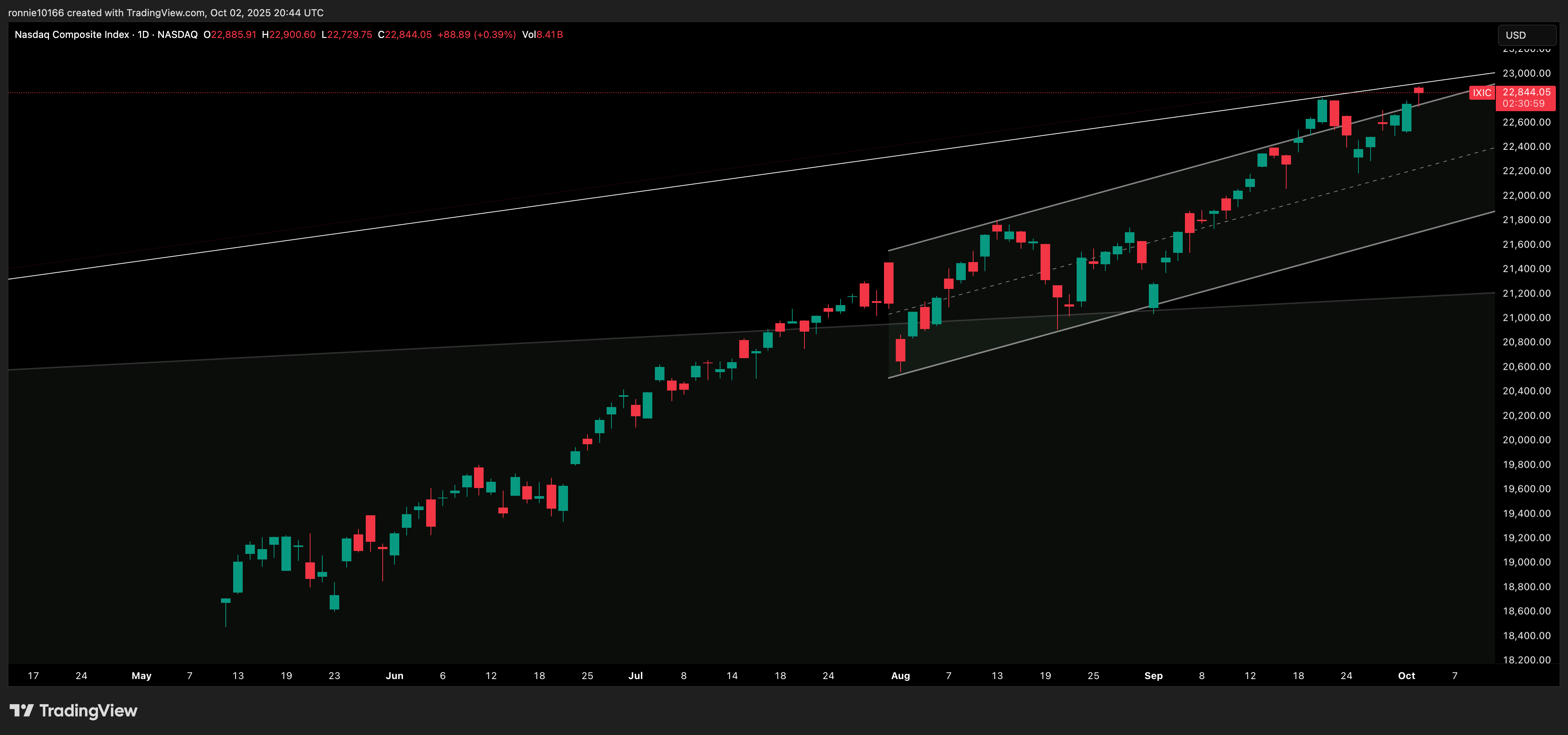 NASDAQ UpdateJust when we thought NFP would do the trickIan ReynoldsOct 03, 2025ShareBack in the wedge for the final time. Yesterday’s close suggests upside pressure may prevail. Looking for a strong impulse to end the week, leading to a 5% gain at around 24,000 in the coming weeks.We’ve come a long way since April 7.PreviousNext
