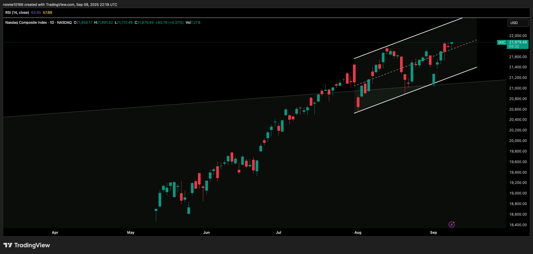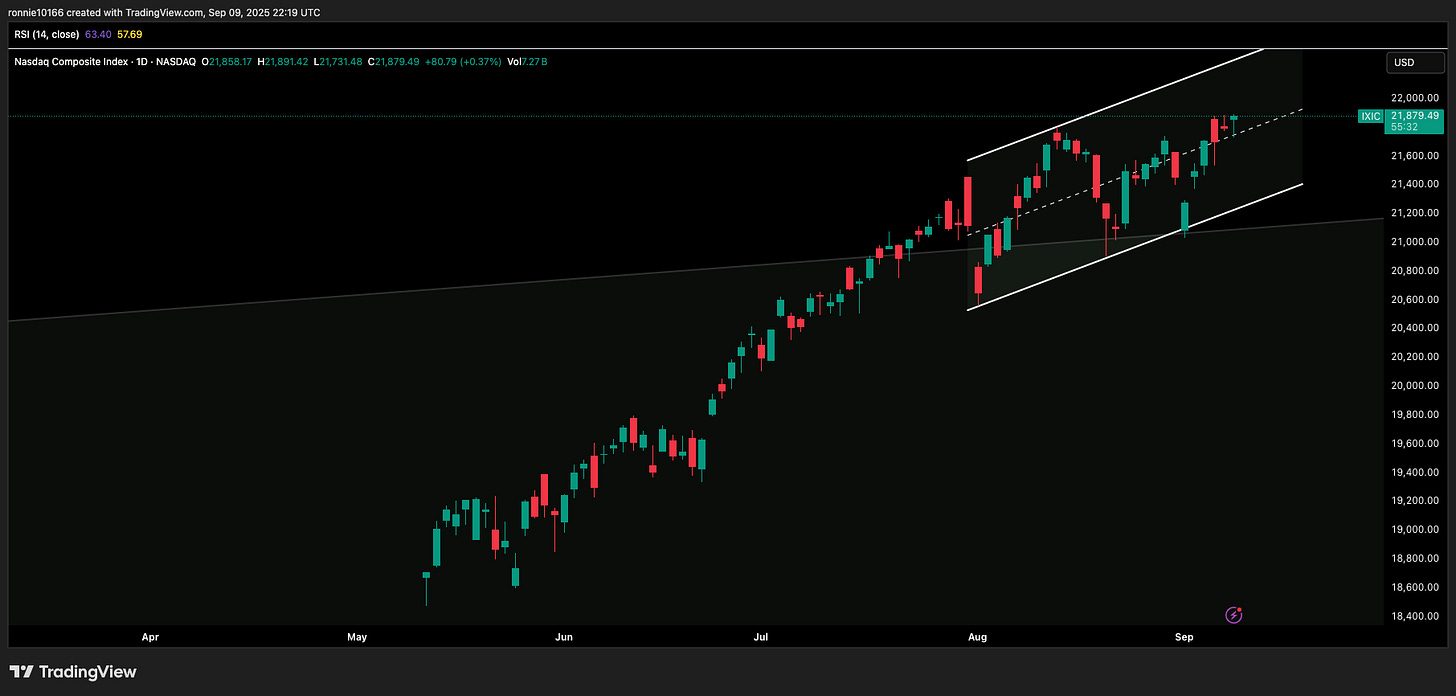 NASDAQ UpdateTrain still going Ian ReynoldsSep 09, 2025ShareNew trend holding and hammer indicates run at 22,500 near term. Tagging the middle of the trend shows clear rejection and short-term momentum is higher.PreviousNext
