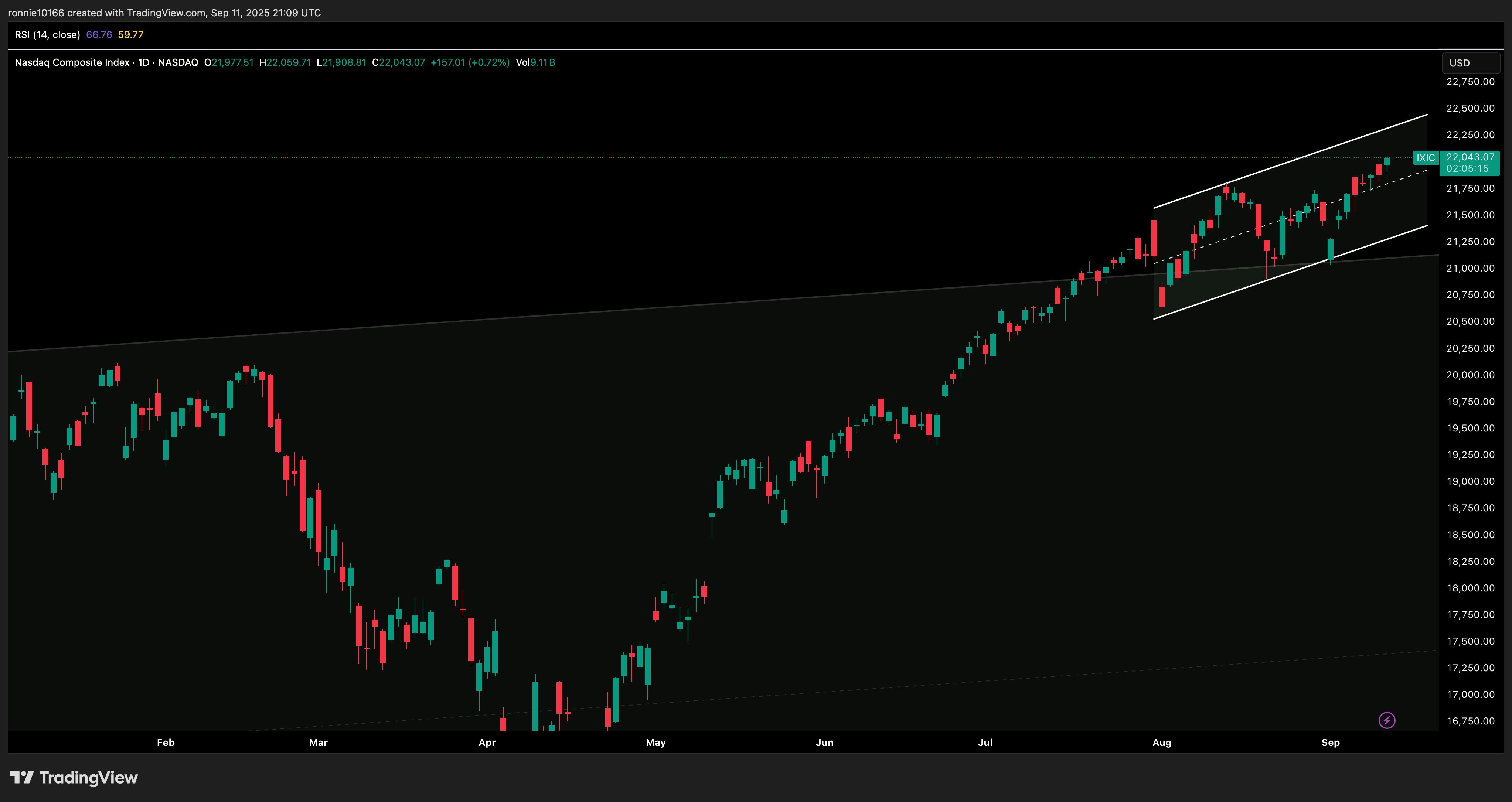 NASDAQ UpdateBack on trackIan ReynoldsSep 11, 2025ShareThe train’s still running, today it’s supported by Initial Jobless Claims suggesting a big cut next week. Yesterday was Oracle. Nvidia……PreviousNext