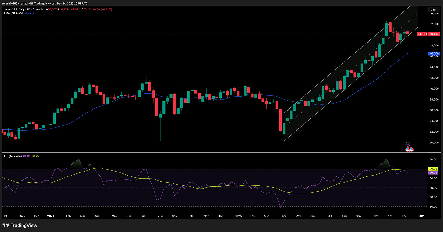 Nikkei 225Still in the grooveIan ReynoldsDec 14, 2025∙ PaidShareOn the weekly, the massive rally since we pushed off the triple bottom at 30,375 doesn’t seem to be stopping, and it’s not overbought.This post is for paid subscribersSubscribeAlready a paid subscriber? Sign inPreviousNext