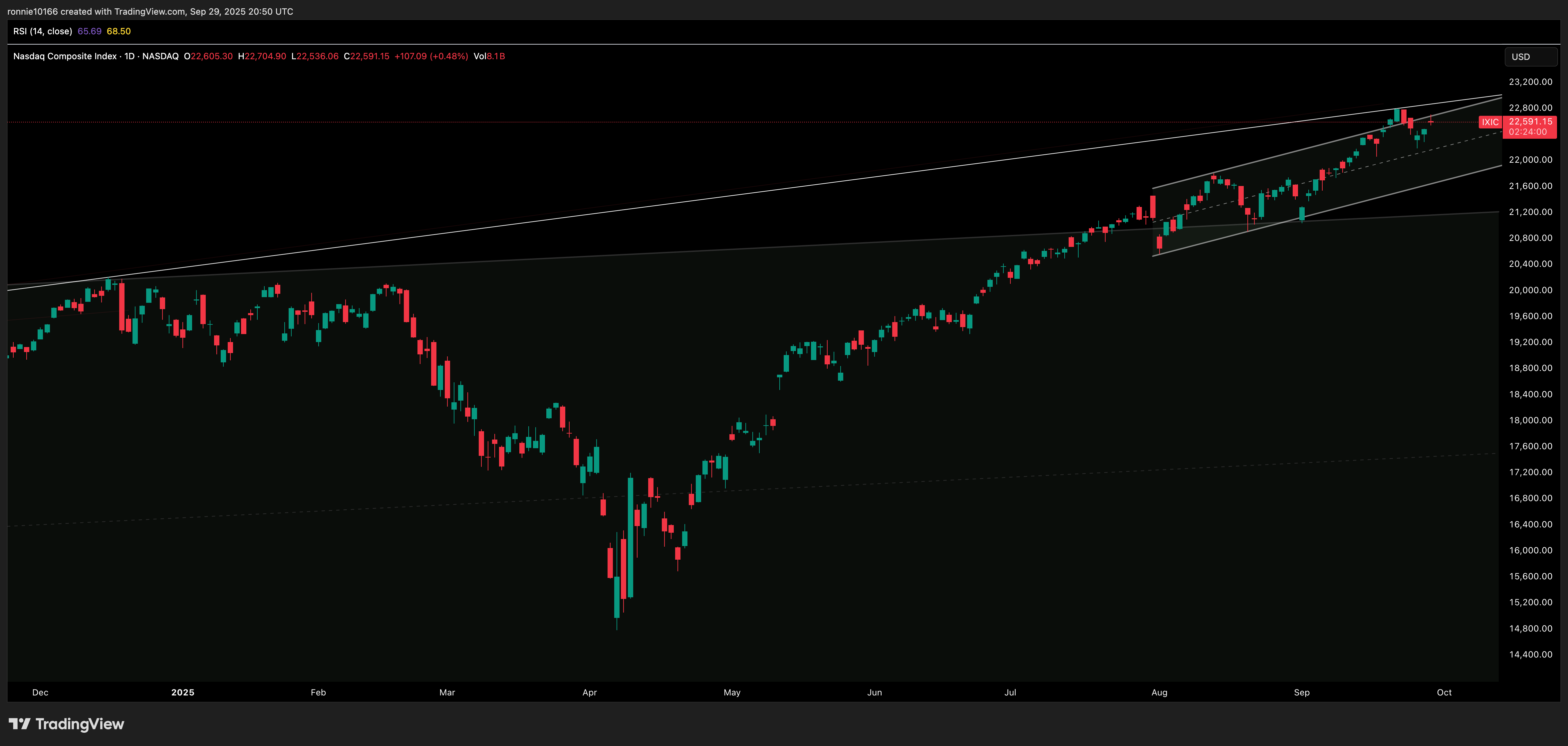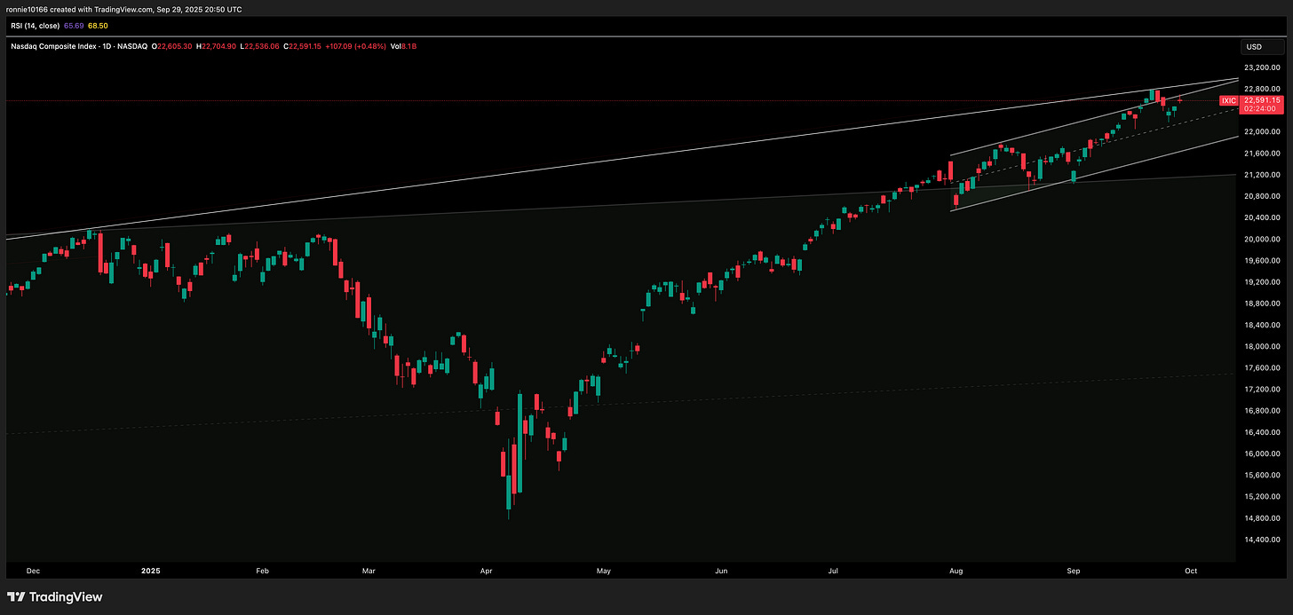 Not much going on but price gaps higher and stays there. We’re drifting up against a crescendo of crash predictions. Those 2 resistance lines will prove a test for the market as price has to make a definitive statement in the next 2 weeks.