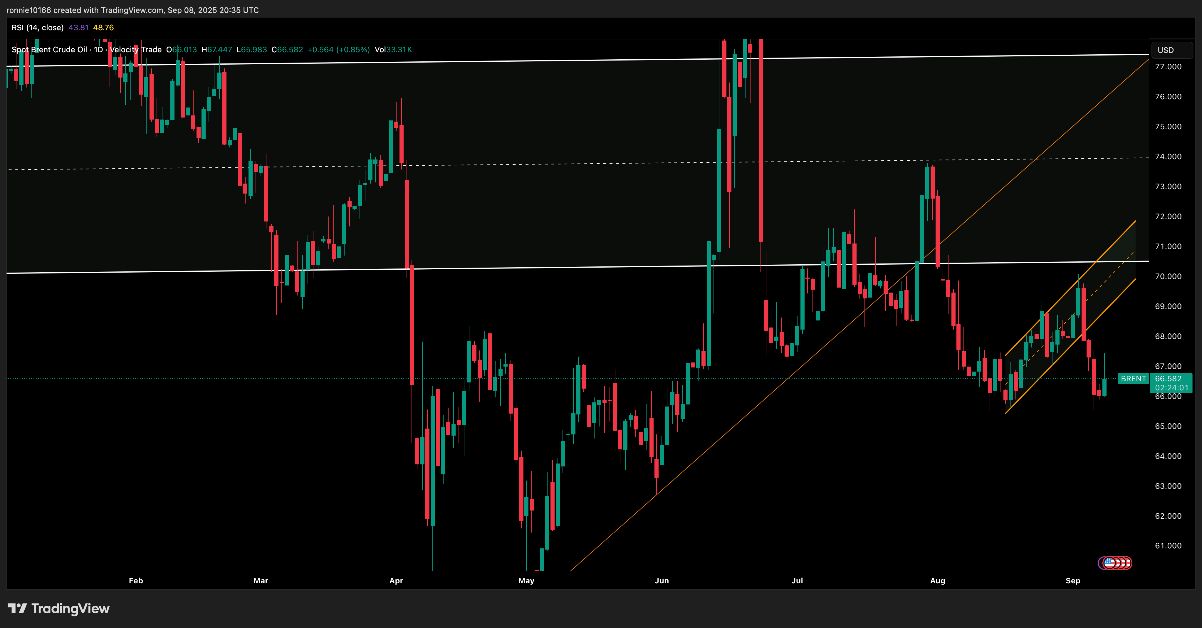Oil UpdateConsolidation after the dropIan ReynoldsSep 08, 2025ShareBRENT tried to spike higher but got rejected. Likely settling into a holding pattern before next week.Support65.60Resistance68.80PreviousNext