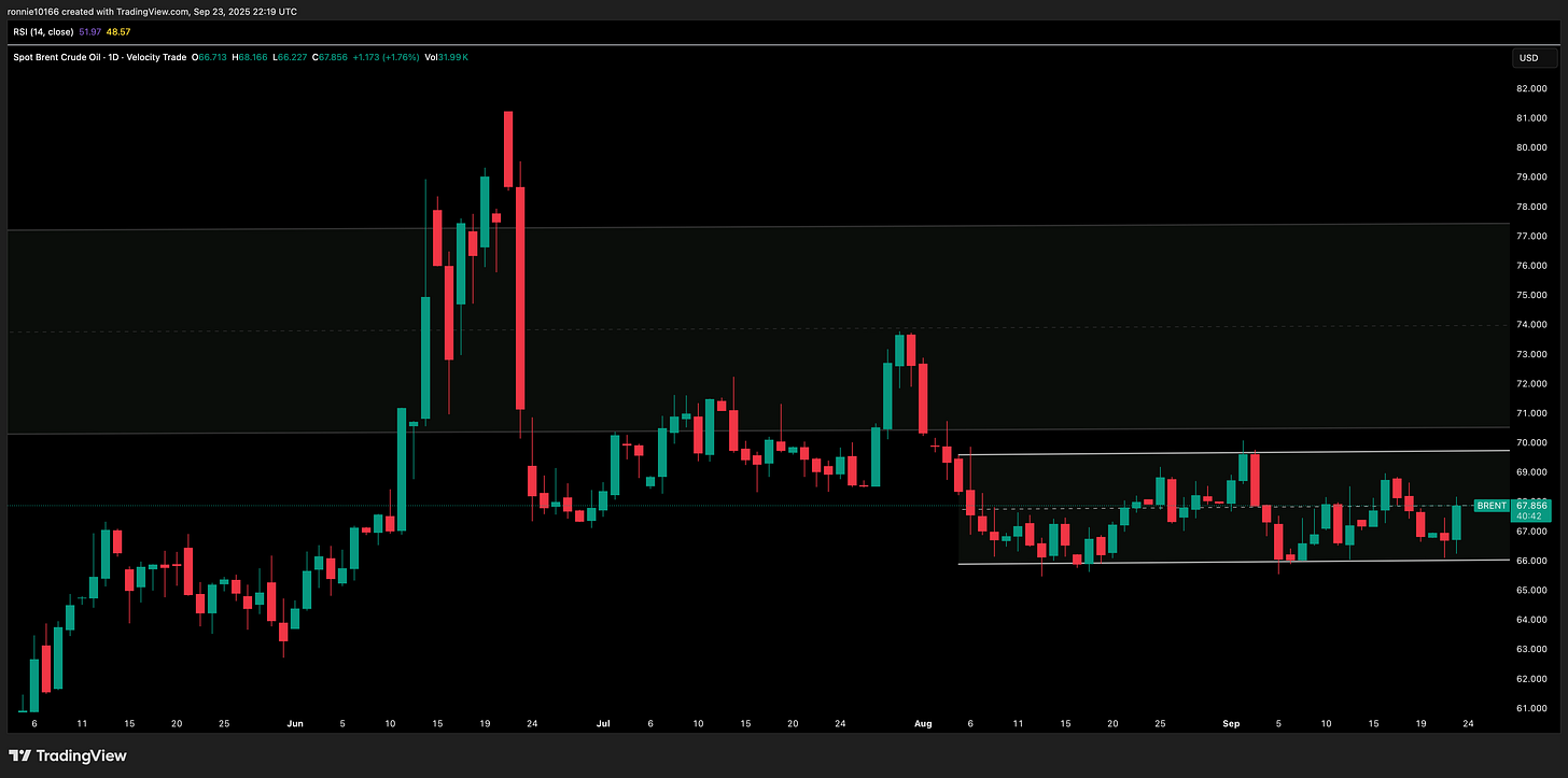 Oil Update 24 September 2024In limboIan ReynoldsSep 23, 2025∙ PaidShareIsrael/Palestine plus Iran/Russia news overnight boosts Spot Brent price but it’s an opportunity to sell at middle of rectangle.Powell now openly talking the deflationary impact of tariffs may get the price down assuming geopolitics can stay away.This post is for paid subscribersSubscribeAlready a paid subscriber? Sign inPreviousNext