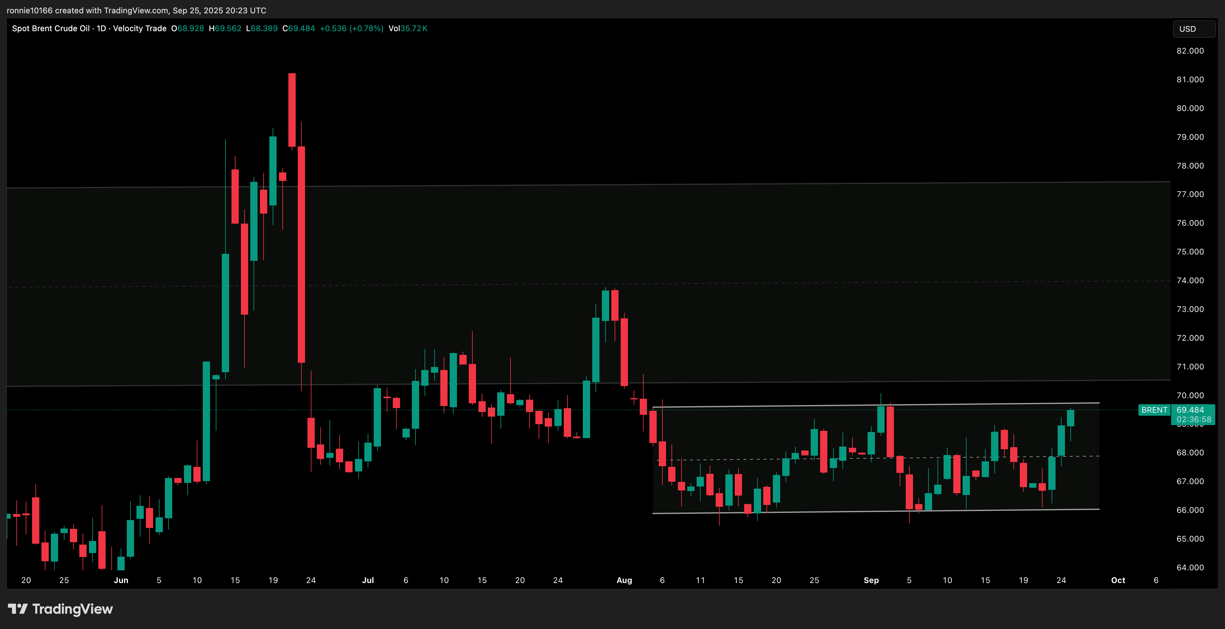 Oil Update 26 September 2025Rectangle looking good but what to do?Ian ReynoldsSep 25, 2025∙ PaidShare69.75 looks a good place to short if that’s your view. The trend is down medium-term but it’s difficult getting short with all the Middle East stuff going on. We’re square now and staying that way until the rectangle breaks.This post is for paid subscribersSubscribeAlready a paid subscriber? Sign inPreviousNext