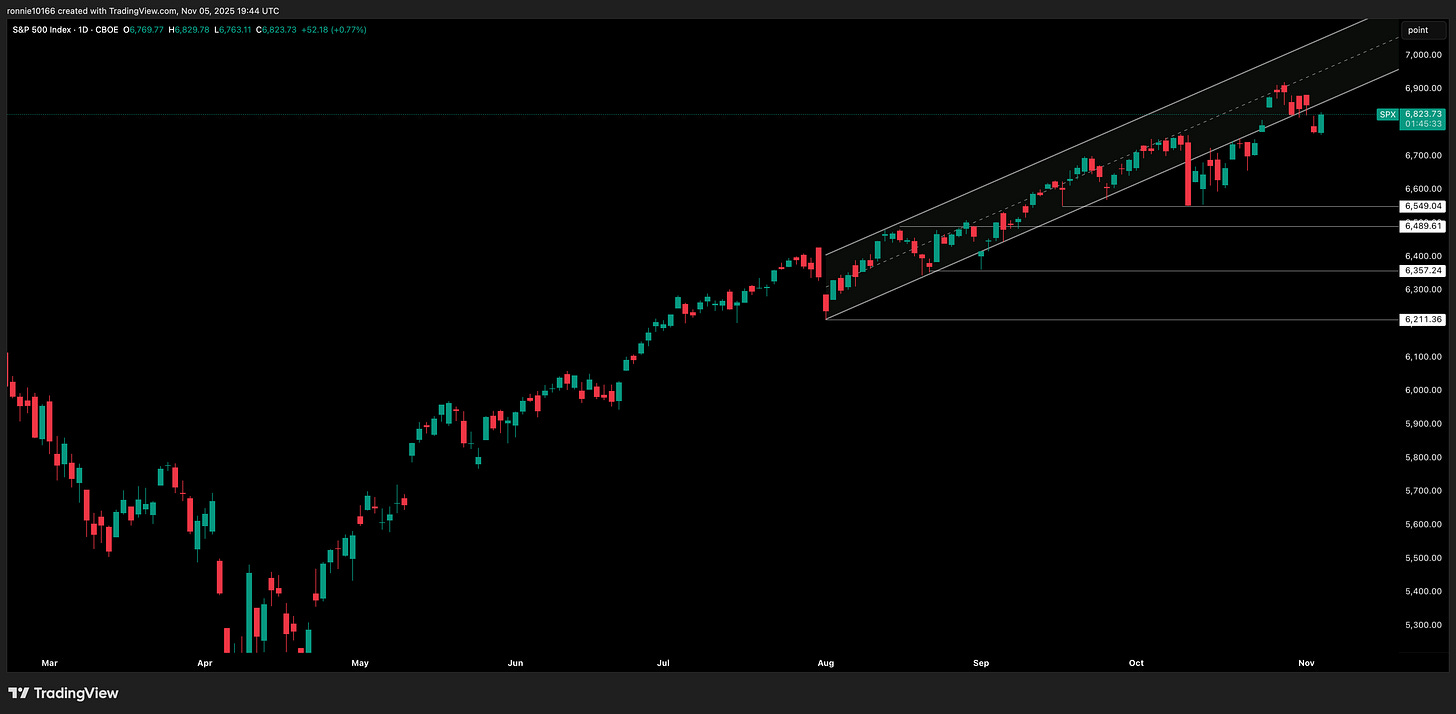 S&P 500Buy the dipIan ReynoldsNov 05, 2025∙ PaidShareEquities rebounded strongly as there was no follow through from the Bitcoin/Asian markets sell-off. Back over 6,855 and we’re back in the trend again with now strong support at 6,770.This post is for paid subscribersSubscribeAlready a paid subscriber? Sign inPreviousNext